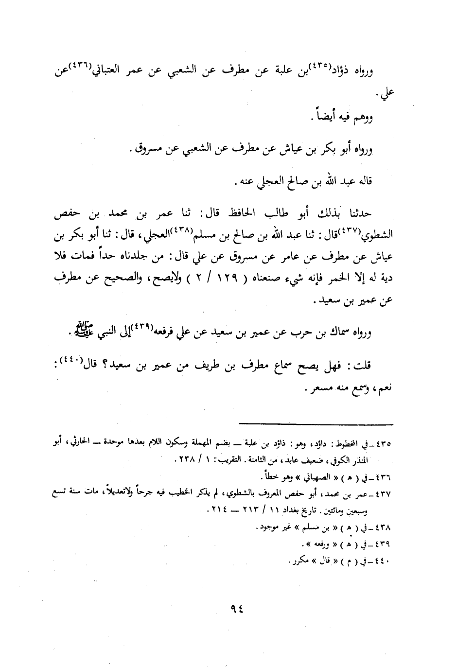 حَدَّثَنَا بِذَلِكَ أَبُو طَالِبٍ الحافظ، قال: حدثنا عُمَرُ بْنُ مُحَمَّدِ بْنِ حَفْصٍ الشَّطَوِيُّ، قَالَ: حدثنا عَبْدُ اللَّهِ بْنُ صَالِحِ بْنِ مُسْلِمٍ الْعِجْلِيُّ، قال: حدثنا أبو بكر بن عياش عن مطرف عن عَامِرٍ عَنْ مَسْرُوقٍ، عَنْ عَلِيٍّ قَالَ مَنْ جَلَدْنَاهُ حَدًّا فَمَاتَ فَلَا دِيَةَ لَهُ إِلَّا الْخَمْرَ فَإِنَّهُ شَيْءٌ صَنَعْنَاهُ وَلَا يَصِحُّ وَالصَّحِيحُ عَنْ مُطَرِّفٍ عَنْ عُمَيْرِ بْنِ سَعِيدٍ.