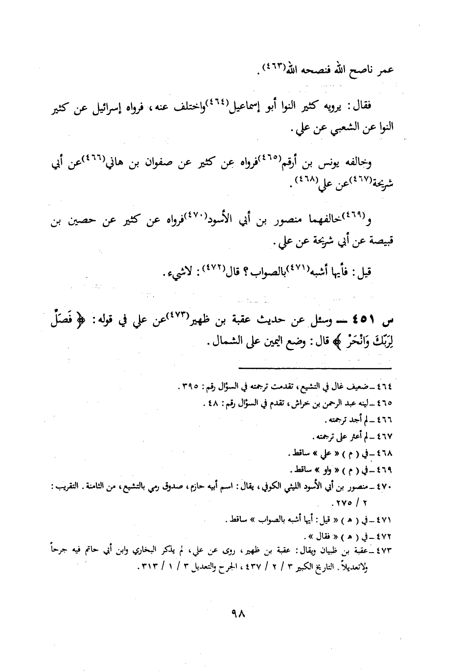 450- وَسُئِلَ عَنْ حَدِيثِ الشَّعْبِيِّ، عَنْ عَلِيٍّ قَالَ كَانَ أَبُو بَكْرٍ أَوَّاهًا مُنِيبًا وَإِنَّ عُمَرَ نَاصَحَ اللَّهَ فَنَصَحَهُ اللَّهُ.