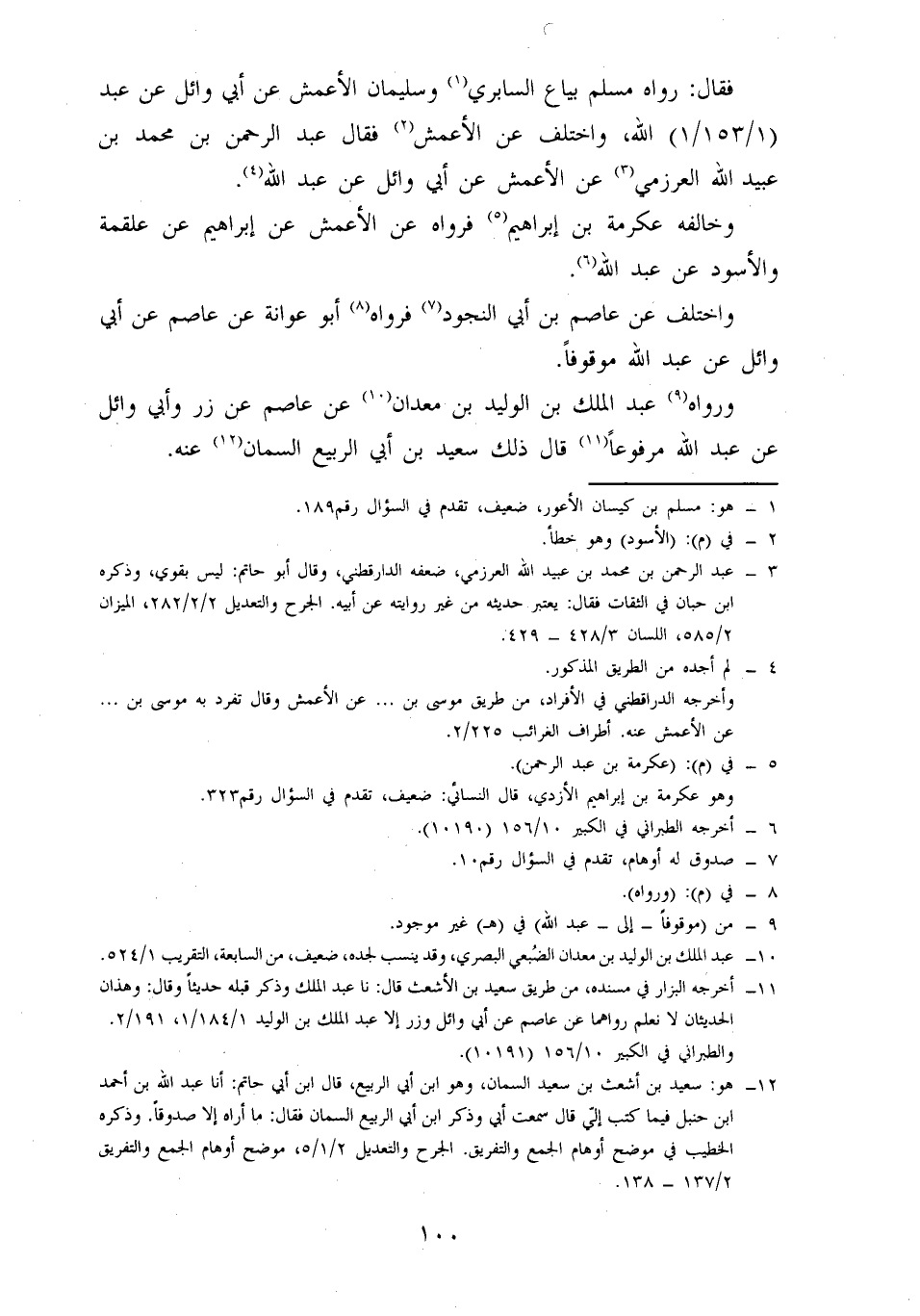 فَقَالَ: رَوَاهُ مُسْلِمٌ بَيَّاعٌ السَّابِرِيُّ، وَسُلَيْمَانُ الْأَعْمَشُ، عَنْ أَبِي وَائِلٍ، عَنْ عَبْدِ اللَّهِ، وَاخْتُلِفَ عَنِ الْأَعْمَشِ؛