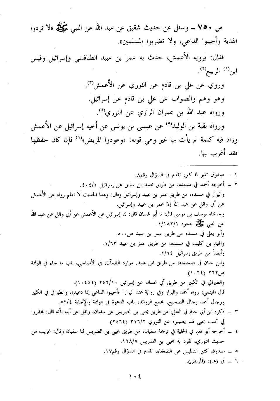 750- وسئل عن حديث شقيق، عَنْ عَبْدِ اللَّهِ، عَنِ النَّبِيِّ صَلَّى اللَّهُ عليه وسلم: لا تَرُدُّوا الْهَدِيَّةَ وَأَجِيبُوا الدَّاعِيَ، وَلَا تَضْرِبُوا الْمُسْلِمِينَ.