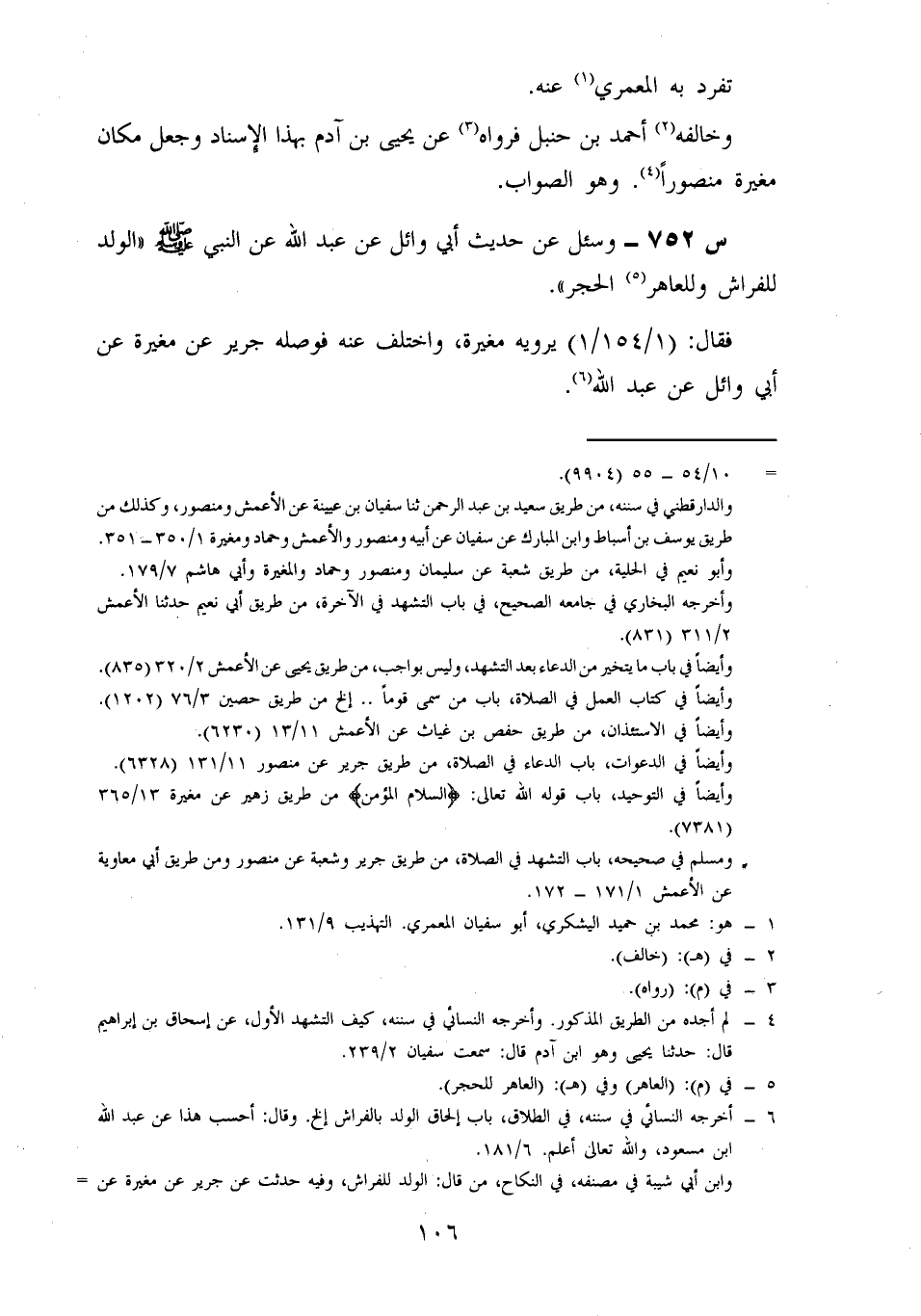 752- وَسُئِلَ عَنْ حَدِيثِ أَبِي وَائِلٍ، عَنْ عَبْدِ اللَّهِ، عَنِ النَّبِيِّ صَلَّى اللَّهُ عَلَيْهِ وَسَلَّمَ؛ الْوَلَدُ لِلْفِرَاشِ، وَلِلْعَاهِرِ الْحَجَرُ.