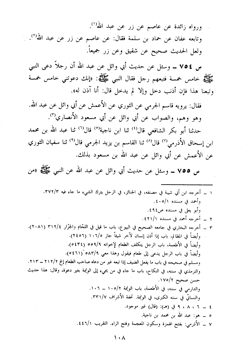 754- وَسُئِلَ عَنْ حَدِيثِ أَبِي وَائِلٍ، عَنْ عَبْدِ اللَّهِ أَنَّ رَجُلًا دَعَا النَّبِيَّ صَلَّى اللَّهُ عَلَيْهِ وَسَلَّمَ خَامِسَ خَمْسَةٍ فَتَبِعَهُمْ رَجُلٌ، فَقَالَ النَّبِيُّ صَلَّى اللَّهُ عَلَيْهِ وَسَلَّمَ: إِنَّكَ دَعَوْتَنِي خَامِسَ خَمْسَةٍ وَتَبِعْنَا هَذَا، فَإِنْ أَذِنْتَ (1) دَخَلَ وَإِلَّا لَمْ يَدْخُلْ، قَالَ: أَنَا آذَنُ لَهُ.
