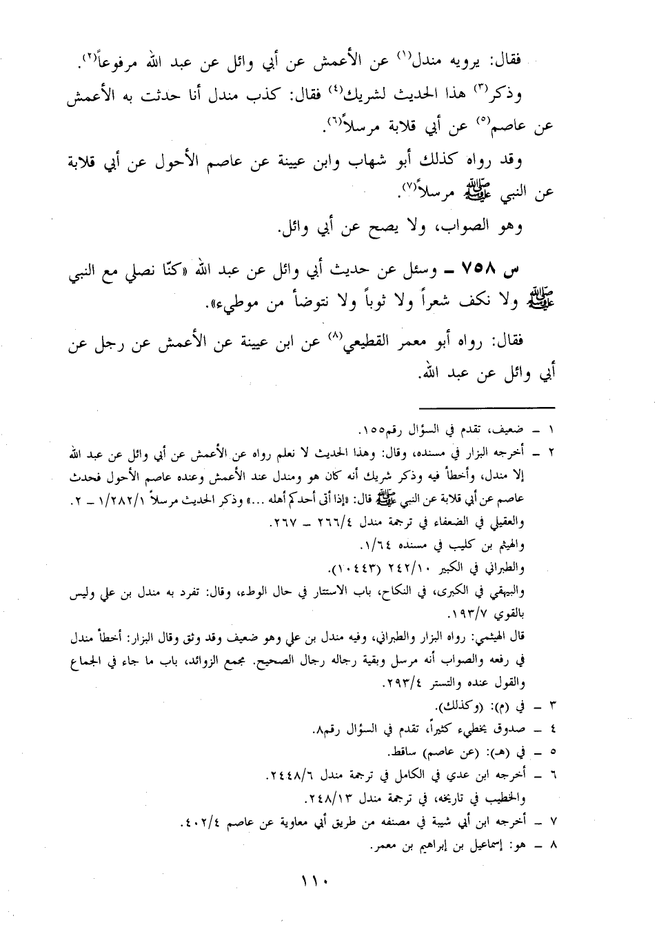 758- وَسُئِلَ عَنْ حَدِيثِ أَبِي وَائِلٍ، عَنْ عَبْدِ اللَّهِ كُنَّا نُصَلِّي مَعَ النَّبِيِّ صَلَّى اللَّهُ عَلَيْهِ وَسَلَّمَ وَلَا نَكُفُّ شَعْرًا، وَلَا ثَوْبًا، وَلَا نَتَوَضَّأُ مِنْ مَوْطِئٍ.