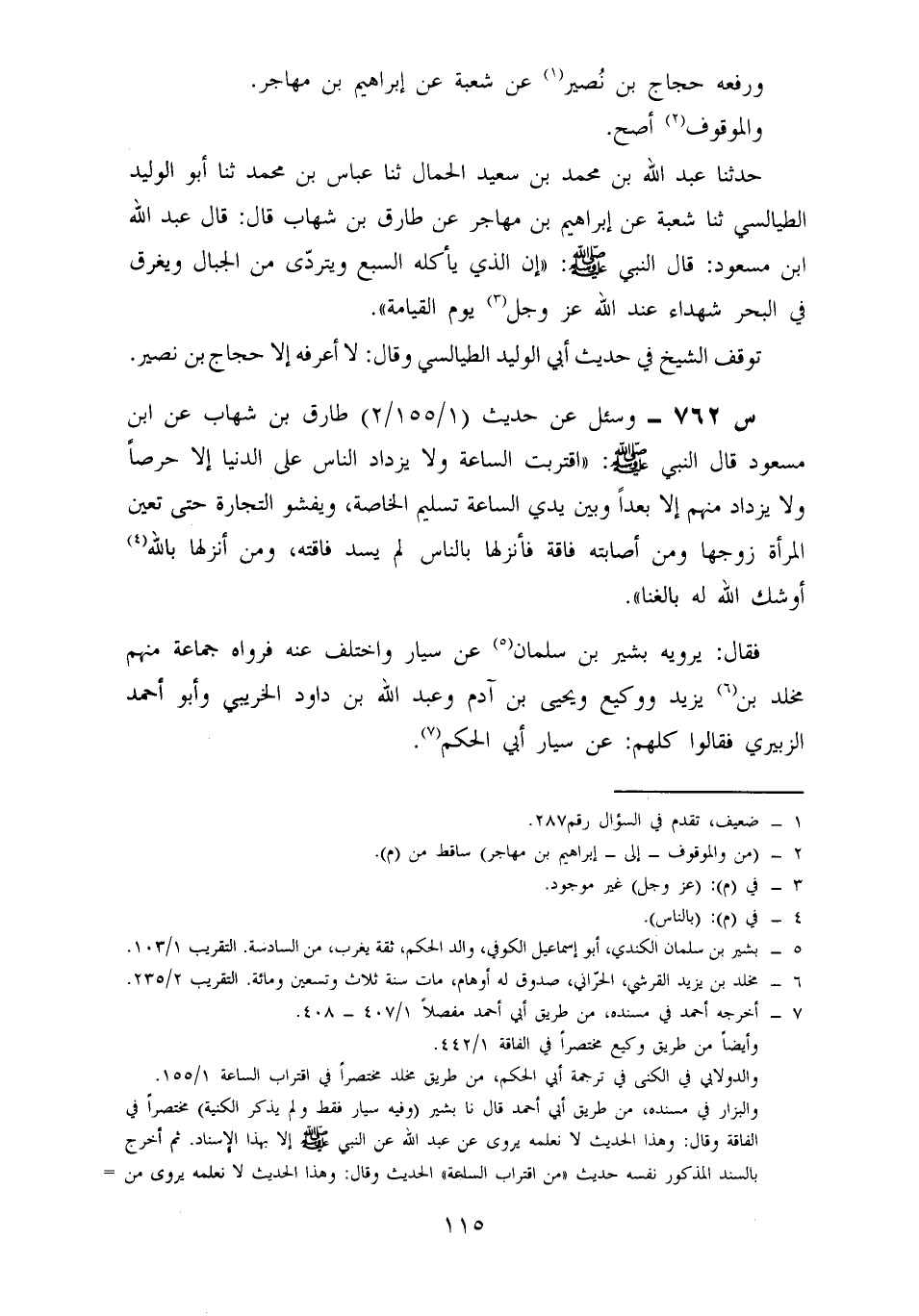 762- وسئل عن حديث طارق بن شهاب، عن ابْنِ مَسْعُودٍ، قَالَ النَّبِيُّ صَلَّى اللَّهُ عَلَيْهِ وَسَلَّمَ: اقْتَرَبَتِ السَّاعَةُ وَلَا يَزْدَادُ النَّاسُ عَلَى الدُّنْيَا إِلَّا حِرْصًا وَلَا يَزْدَادُ مِنْهُمْ إِلَّا بُعْدًا وَبَيْنَ يَدَيِ السَّاعَةِ تَسْلِيمَ الْخَاصَّةِ، وَيَفْشُو التِّجَارَةُ حَتَّى تَعِينَ الْمَرْأَةُ زَوْجَهَا وَمَنْ أَصَابَتُهُ فَاقَةٌ فَأَنْزَلَهَا بِالنَّاسِ لَمْ يُسَدَّ فَاقَتُهُ، وَمَنْ أَنْزَلَهَا بِاللَّهِ أَوْشَكَ اللَّهُ لَهُ بَالْغِنَا.