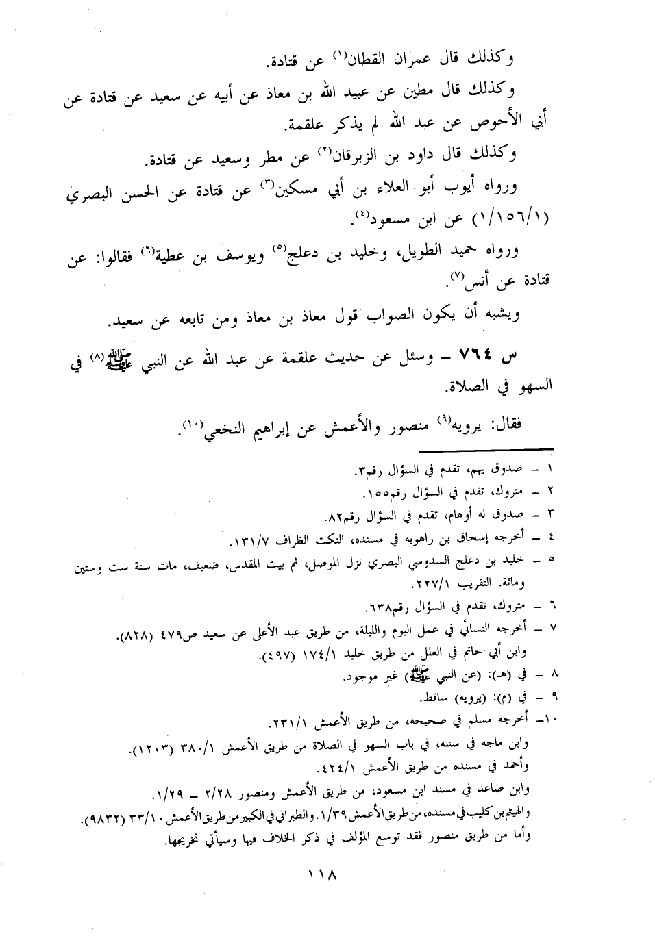 764- وَسُئِلَ عَنْ حَدِيثِ عَلْقَمَةَ، عَنْ عَبْدِ اللَّهِ، عَنِ النَّبِيِّ صَلَّى اللَّهُ عليه وسلم في السَّهْوِ فِي الصَّلَاةِ.