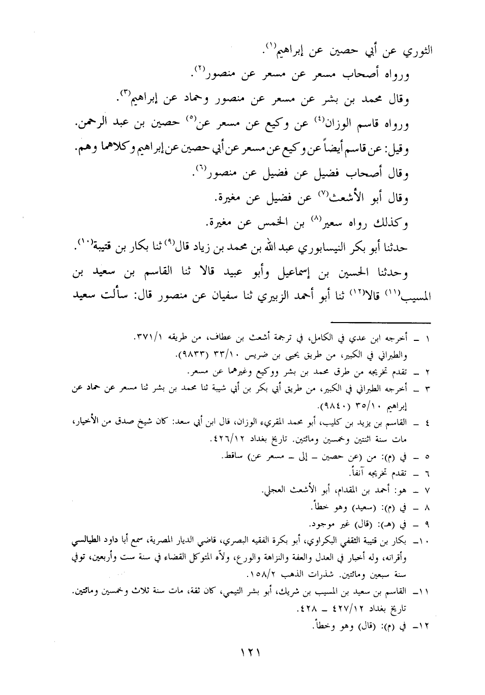 وَقِيلَ: عَنْ قَاسِمٍ أَيْضًا، عَنْ وَكِيعٍ، عَنْ مِسْعَرٍ، عَنْ أَبِي حُصَيْنٍ، عَنْ إِبْرَاهِيمَ، وَكِلَاهُمَا وَهِمٌ.