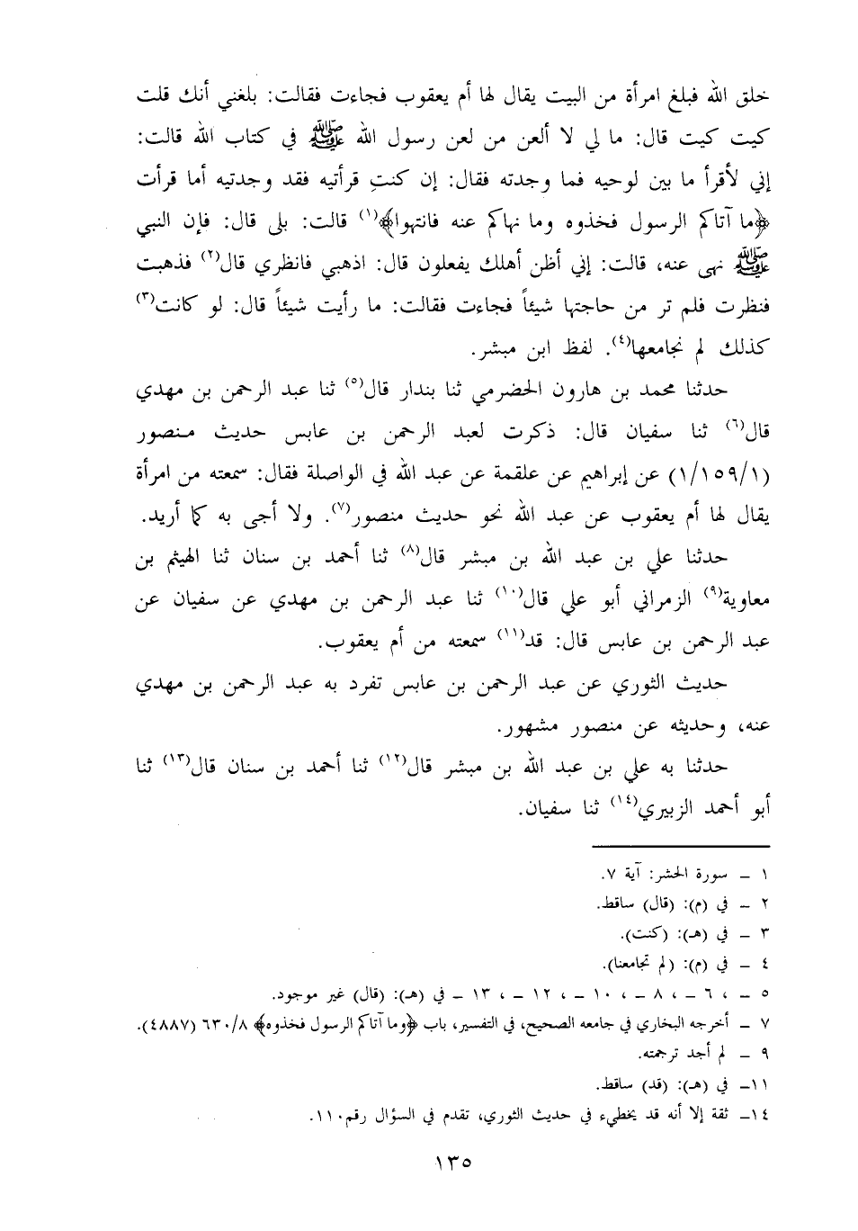 حَدَّثَنَا محمد بن هارون الحضرمي حدثنا بندار، قال: حدثنا عبد الرحمن بن مهدي، قال: حدثنا سُفْيَانُ قَالَ ذَكَرْتُ لِعَبْدِ الرَّحْمَنِ بْنِ عَابِسٍ حَدِيثَ مَنْصُورٍ عَنْ إِبْرَاهِيمَ، عَنْ عَلْقَمَةَ، عَنْ عَبْدِ اللَّهِ فِي الْوَاصِلَةِ فَقَالَ سَمِعْتُهُ مِنَ امْرَأَةٍ يُقَالُ لَهَا أُمُّ يَعْقُوبَ عَنْ عَبْدِ الله نحو حديث منصور ولا أجى بِهِ كَمَا أُرِيدُ.