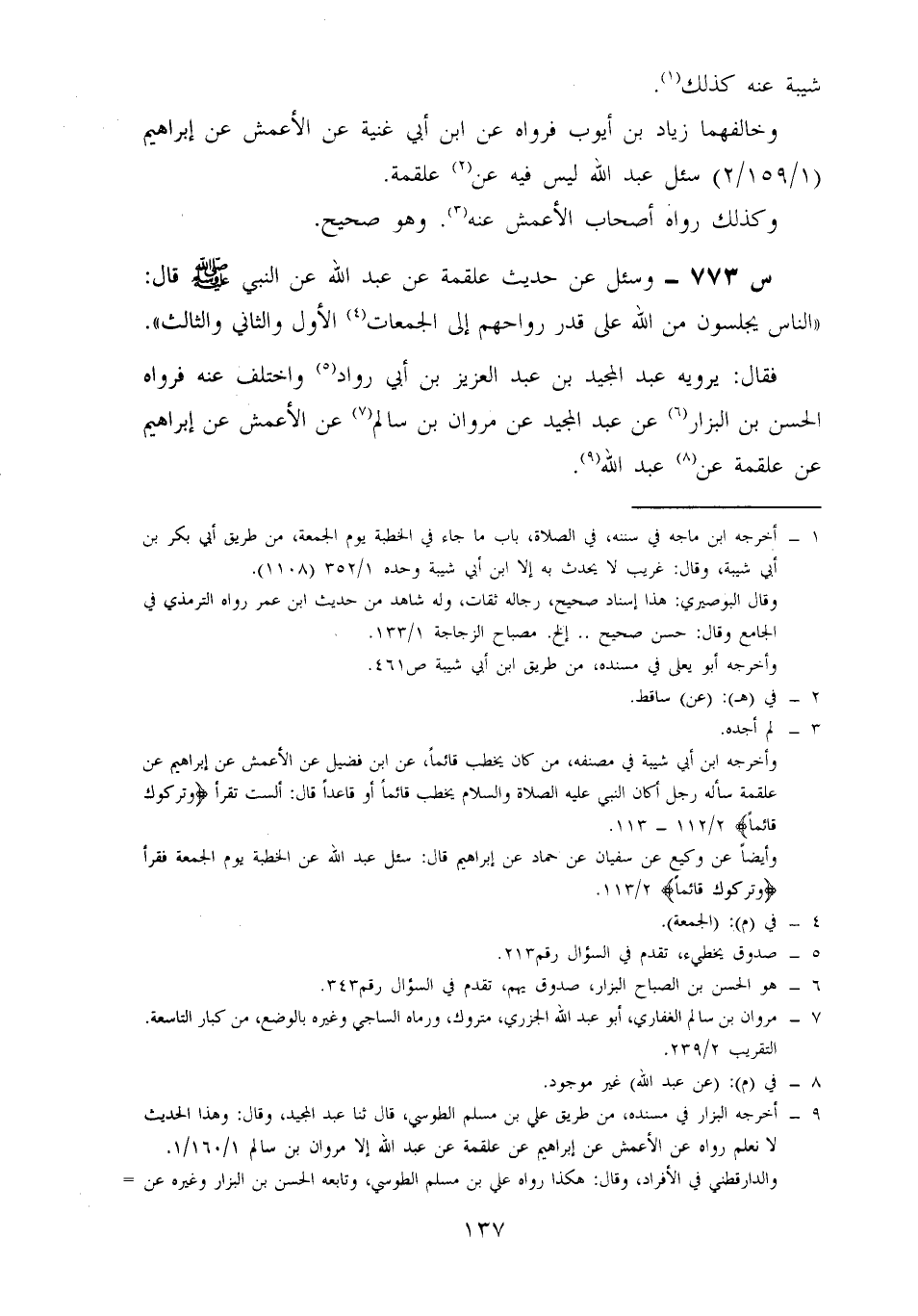 773- وَسُئِلَ عَنْ حَدِيثِ عَلْقَمَةَ، عَنْ عَبْدِ اللَّهِ، عَنِ النَّبِيِّ صَلَّى اللَّهُ عليه وسلم، قال: النَّاسُ يَجْلِسُونَ مِنَ اللَّهِ عَلَى قَدْرِ رَوَاحِهِمْ إِلَى الْجُمُعَاتِ الْأَوَّلُ وَالثَّانِي وَالثَّالِثُ.