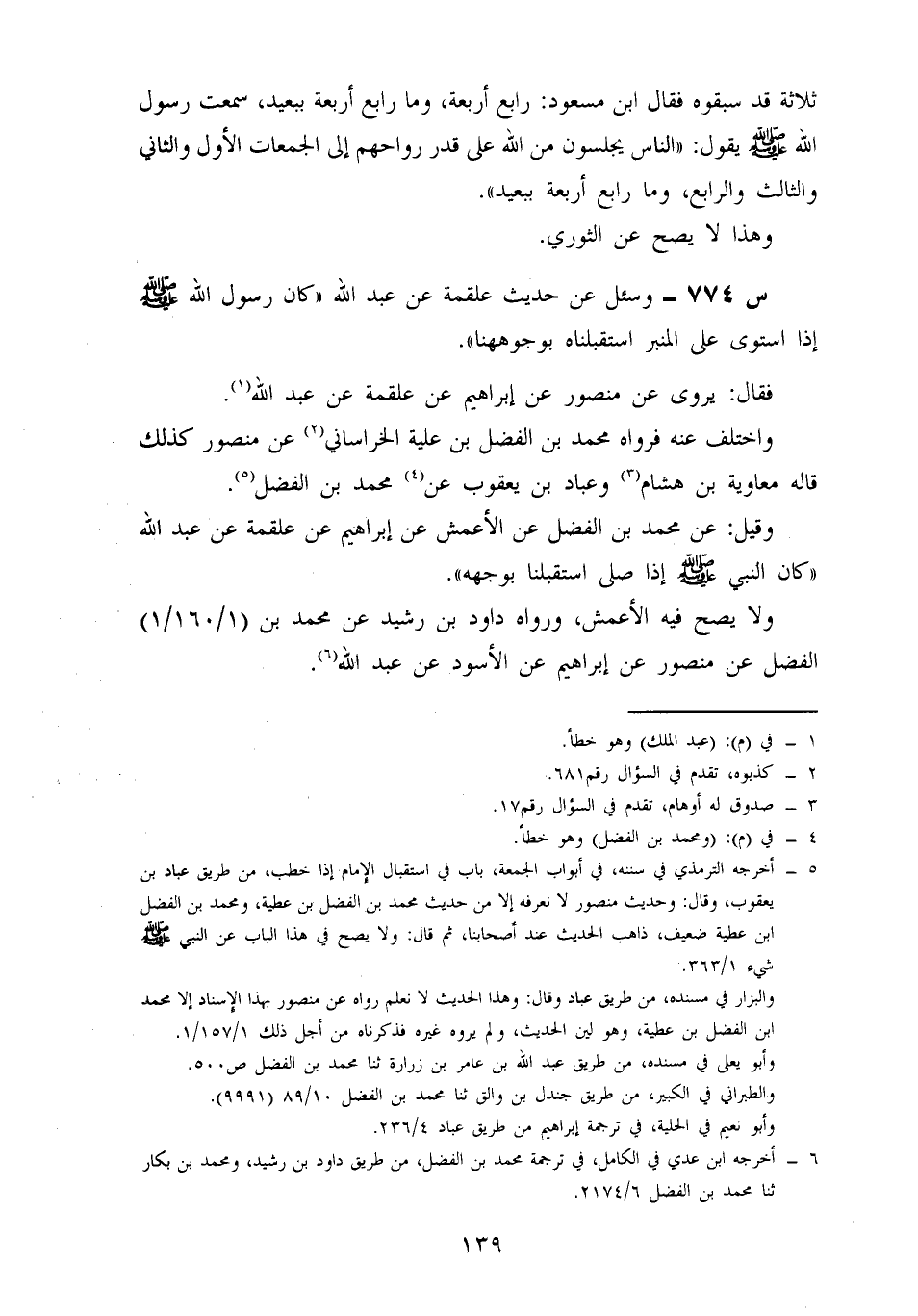774- وَسُئِلَ عَنْ حَدِيثِ عَلْقَمَةَ، عَنْ عَبْدِ اللَّهِ؛ كَانَ رَسُولُ اللَّهِ صَلَّى اللَّهُ عَلَيْهِ وَسَلَّمَ إِذَا اسْتَوَى عَلَى الْمِنْبَرِ اسْتَقْبَلْنَاهُ بِوُجُوهِنَا.