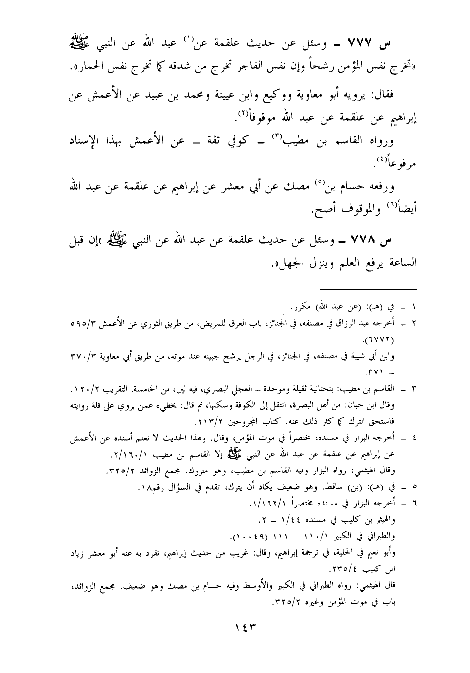 777- وَسُئِلَ عَنْ حَدِيثِ عَلْقَمَةَ، عَنْ عَبْدِ اللَّهِ، عَنِ النَّبِيِّ صَلَّى اللَّهُ عَلَيْهِ وَسَلَّمَ: تَخْرُجُ نَفْسُ الْمُؤْمِنِ رَشْحًا وَإِنَّ نَفْسَ الْفَاجِرِ تَخْرُجُ مِنْ شِدْقِهِ كَمَا تَخْرُجُ نَفَسُ الْحِمَارِ.
