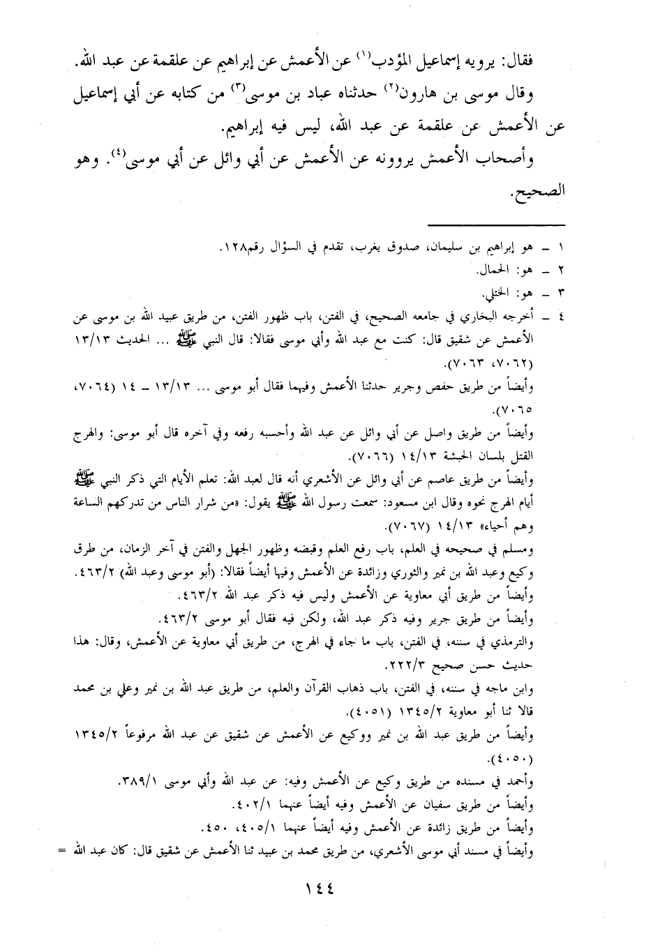 وَقَالَ مُوسَى بْنُ هَارُونَ: حَدَّثَنَاهُ عَبَّادُ بْنُ مُوسَى مِنْ كِتَابِهِ، عَنْ أَبِي إِسْمَاعِيلَ، عَنِ الْأَعْمَشِ، عَنْ عَلْقَمَةَ، عَنْ عَبْدِ اللَّهِ، لَيْسَ فِيهِ إِبْرَاهِيمُ.