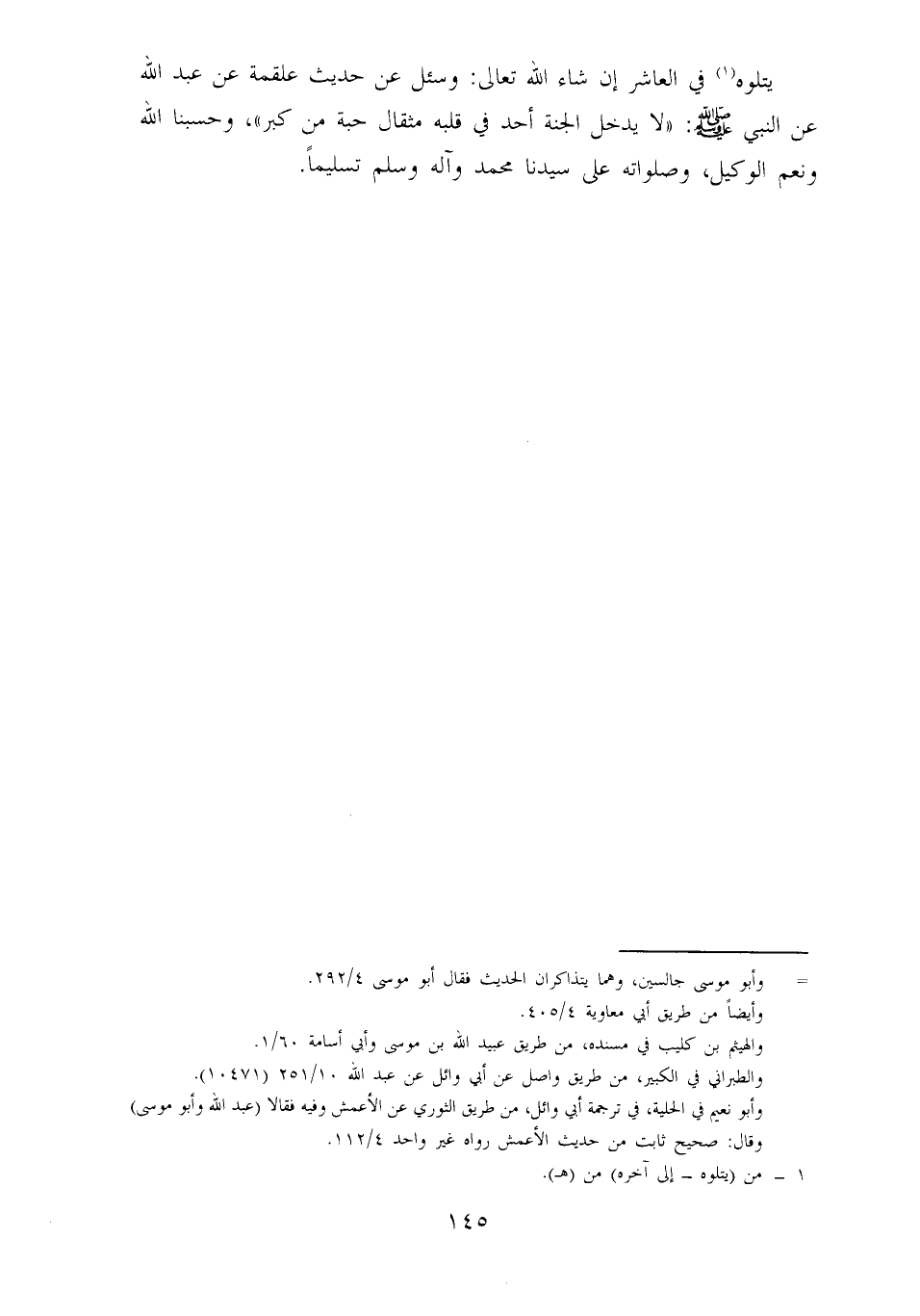 يَتْلُوهُ فِي الْعَاشِرِ إِنْ شَاءَ اللَّهُ تَعَالَى: وَسُئِلَ عَنْ حَدِيثِ عَلْقَمَةَ، عَنْ عَبْدِ اللَّهِ، عَنِ النَّبِيِّ صَلَّى اللَّهُ عليه وسلم: لا يَدْخُلُ الْجَنَّةَ أَحَدٌ فِي قَلْبِهِ مِثْقَالُ حَبَّةٍ مِنْ كِبْرٍ. وَحَسْبُنَا اللَّهُ وَنِعْمَ الْوَكِيلُ وَصَلَوَاتُهُ عَلَى سَيِّدِنَا محمد وآله وسلم تسليما