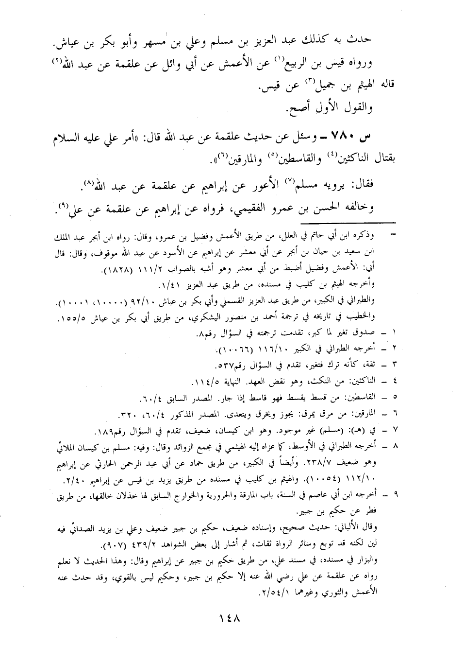 780- وَسُئِلَ عَنْ حَدِيثِ عَلْقَمَةَ، عَنْ عَبْدِ اللَّهِ، قَالَ أَمَرَ عَلِيٌّ عَلَيْهِ السَّلَامُ بِقِتَالِ النَّاكِثِينَ وَالْقَاسِطِينَ وَالْمَارِقِينَ.