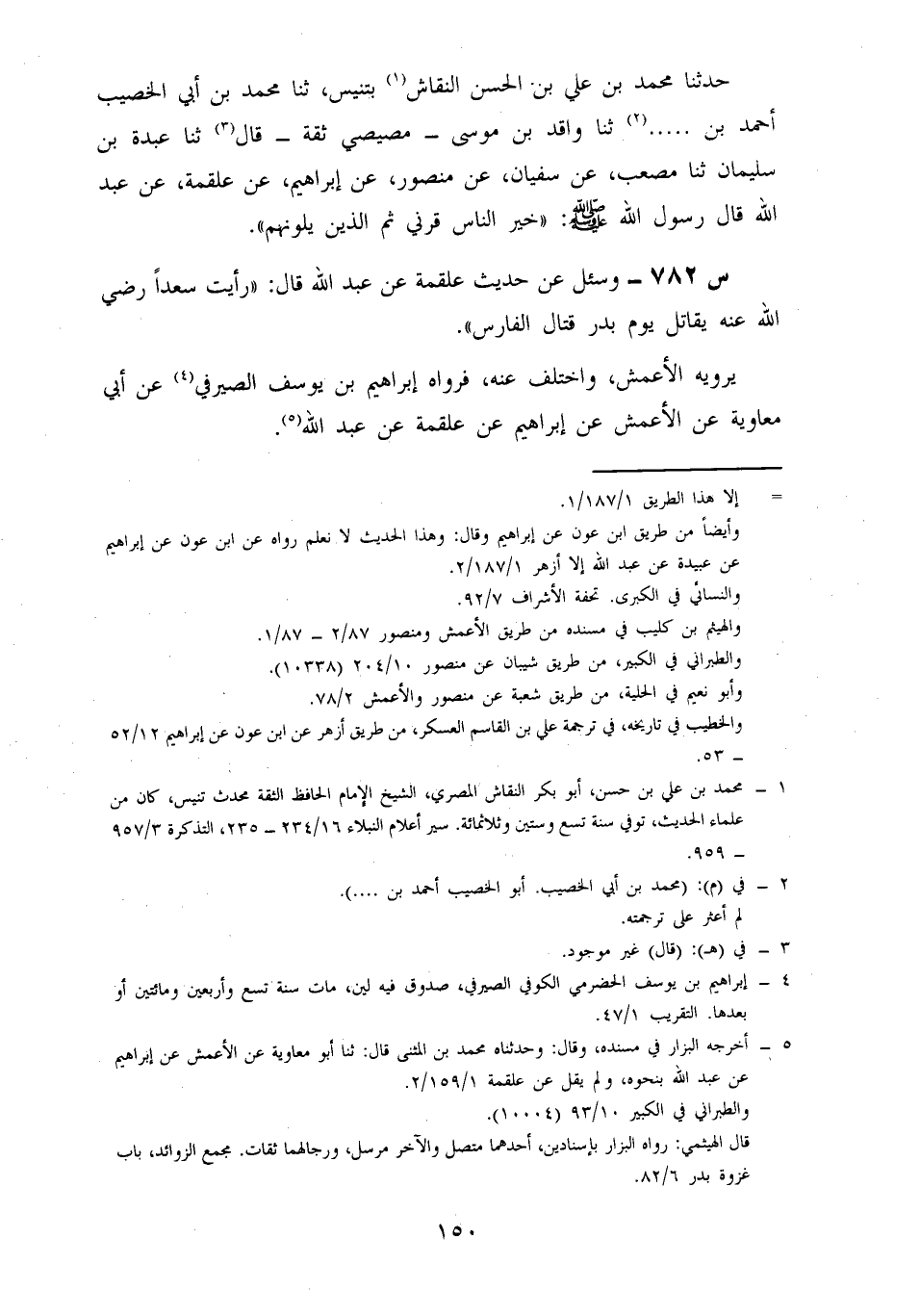 782- وَسُئِلَ عَنْ حَدِيثِ عَلْقَمَةَ، عَنْ عَبْدِ اللَّهِ، قال رأيت سعد رضي الله عَنْهُ يُقَاتِلُ يَوْمَ بَدْرٍ قِتَالَ الْفَارِسِ.