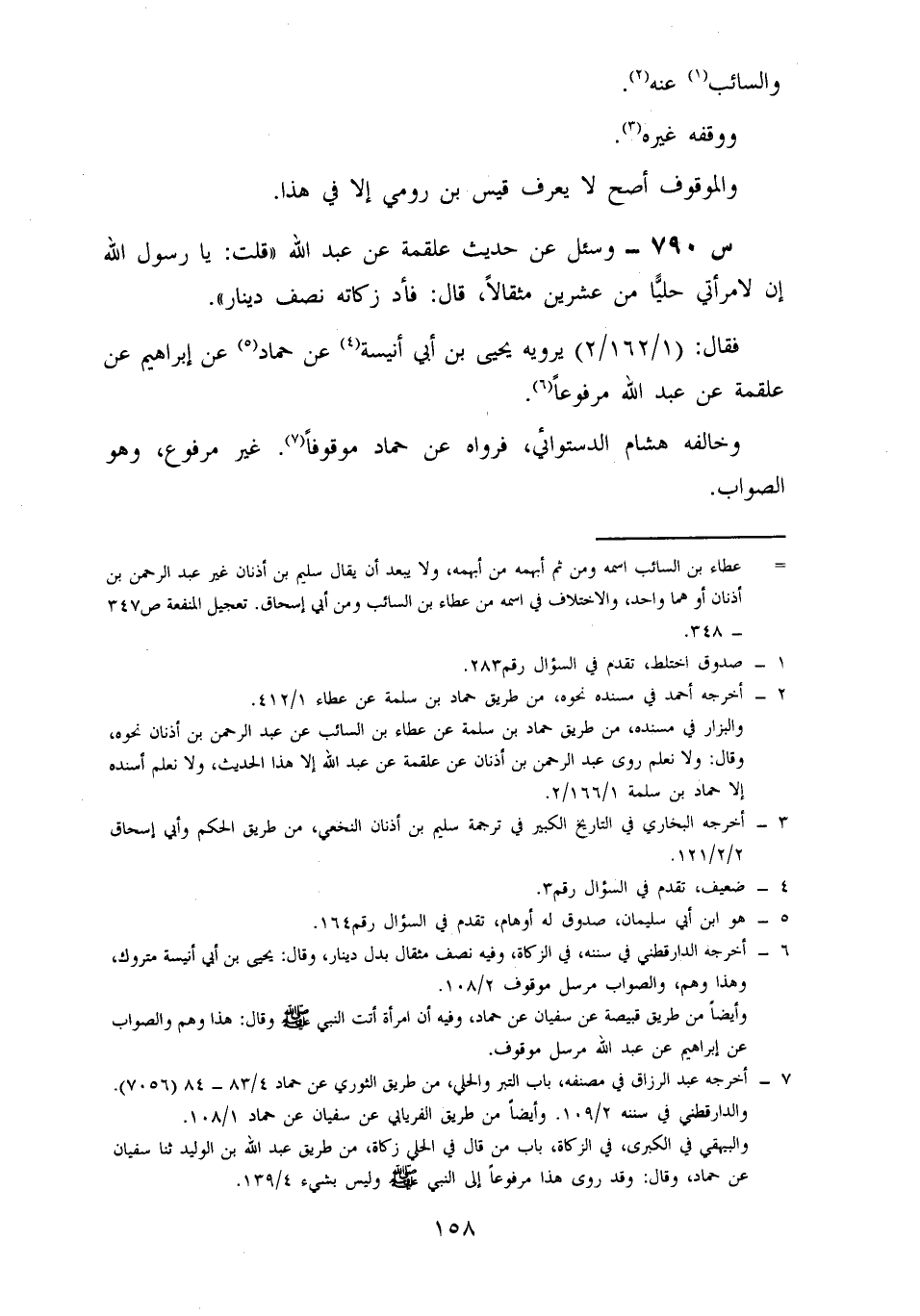 790- وَسُئِلَ عَنْ حَدِيثِ عَلْقَمَةَ، عَنْ عَبْدِ اللَّهِ قُلْتُ: يَا رَسُولَ اللَّهِ، إِنَّ لِامْرَأَتِي حُلِيًّا مِنْ عِشْرِينَ مِثْقَالًا، قَالَ: فَأَدِ زَكَاتَهُ نِصْفَ دِينَارٍ.