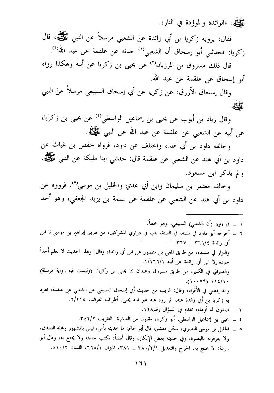 فَقَالَ: يَرْوِيهِ زَكَرِيَّا بْنُ أَبِي زَائِدَةَ، عَنِ الشَّعْبِيِّ مُرْسَلًا، عَنِ النَّبِيِّ صَلَّى اللَّهُ عَلَيْهِ وَسَلَّمَ، قَالَ زَكَرِيَّا: فَحَدَّثَنِي أَبُو إِسْحَاقَ أَنَّ الشَّعْبِيَّ، حَدَّثَهُ عَنْ عَلْقَمَةَ، عن عبد الله.