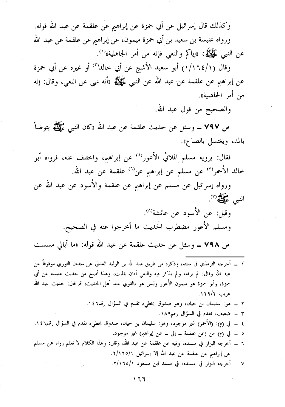 797- وَسُئِلَ عَنْ حَدِيثِ عَلْقَمَةَ، عَنْ عَبْدِ اللَّهِ؛ كَانَ النَّبِيُّ صَلَّى اللَّهُ عَلَيْهِ وَسَلَّمَ يَتَوَضَّأُ بِالْمُدِّ وَيَغْتَسِلُ بِالصَّاعِ.