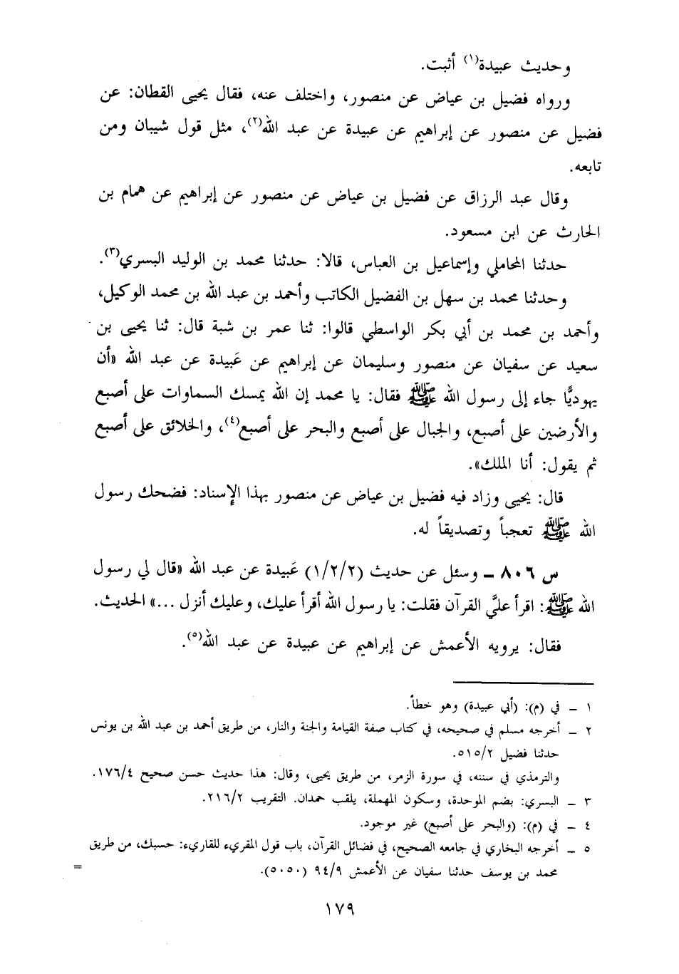 حَدَّثَنَا الْمَحَامِلِيُّ وَإِسْمَاعِيلُ بْنُ الْعَبَّاسِ قَالَا حَدَّثَنَا محمد بن الوليد البسري (ح) وَحَدَّثَنَا مُحَمَّدُ بْنُ سَهْلِ بْنِ الْفُضَيْلِ الْكَاتِبُ وَأَحْمَدُ بْنُ عَبْدِ اللَّهِ بْنِ مُحَمَّدٍ الْوَكِيلُ، وَأَحْمَدُ بْنُ مُحَمَّدِ بْنِ أَبِي بَكْرٍ الْوَاسِطِيُّ قالوا حدثنا عمر بن شبة، قال: حدثنا يَحْيَى بْنُ سَعِيدٍ عَنْ سُفْيَانَ، عَنْ مَنْصُورٍ وَسُلَيْمَانُ عَنْ إِبْرَاهِيمَ، عَنْ عَبِيدَةَ، عَنْ عَبْدِ اللَّهِ أَنَّ يَهُودِيًّا جَاءَ إِلَى رَسُولِ اللَّهِ صَلَّى اللَّهُ عَلَيْهِ وَسَلَّمَ فَقَالَ يَا مُحَمَّدُ إِنَّ اللَّهَ يُمْسِكُ السَّمَاوَاتِ عَلَى أُصْبَعٍ وَالْأَرْضِينَ عَلَى أُصْبَعٍ وَالْجِبَالَ عَلَى أُصْبَعٍ وَالْبَحْرَ عَلَى أُصْبَعٍ وَالْخَلَائِقَ عَلَى أُصْبَعٍ ثُمَّ يَقُولُ أَنَا الْمَلِكُ