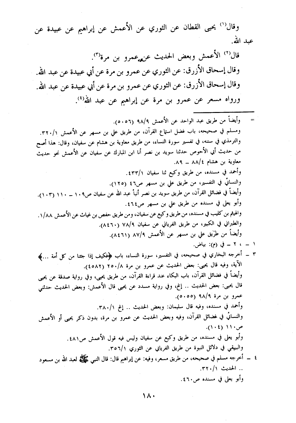 وَقَالَ يَحْيَى الْقَطَّانُ: عَنِ الثَّوْرِيِّ، عَنِ الْأَعْمَشِ، عن إبراهيم، عن عبيدة، عن عبد الله.
