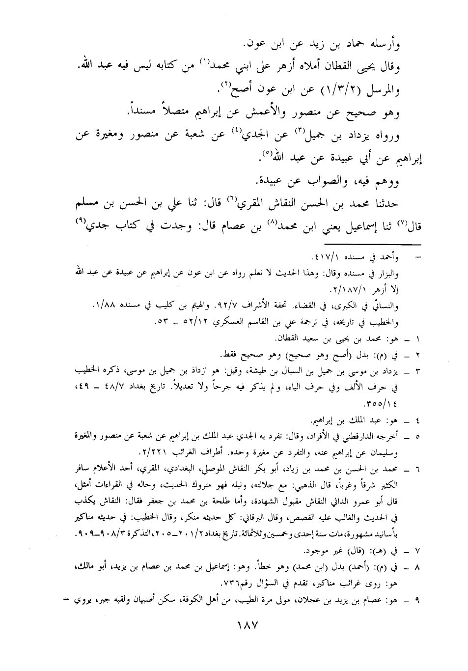 وَأَرْسَلَهُ حَمَّادُ بْنُ زَيْدٍ، عَنِ ابْنِ عَوْنٍ.