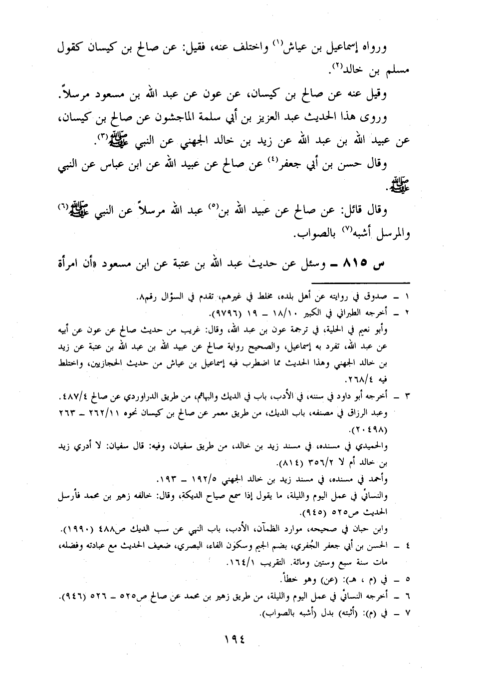 وَقِيلَ عَنْهُ: عَنْ صَالِحِ بْنِ كَيْسَانَ، عَنْ عَوْنٍ، عَنْ عَبْدِ اللَّهِ بْنِ مَسْعُودٍ مُرْسَلًا.