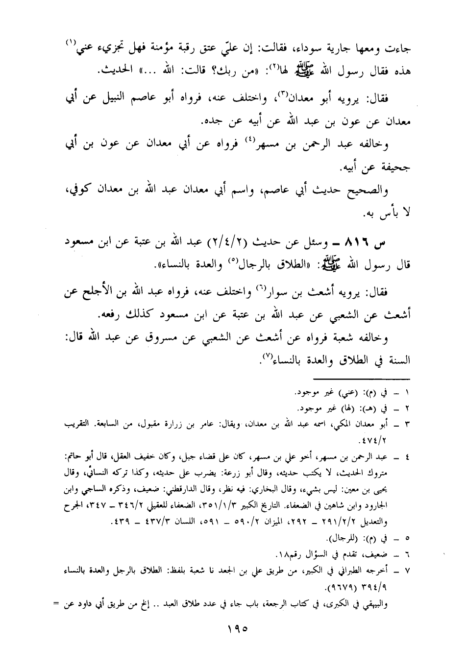 815- وَسُئِلَ عَنْ حَدِيثِ عَبْدِ اللَّهِ بْنِ عُتْبَةَ، عَنِ ابْنِ مَسْعُودٍ أَنَّ امْرَأَةً جَاءَتْ وَمَعَهَا جَارِيَةٌ سَوْدَاءُ، فَقَالَتْ: إِنَّ عَلَيَّ عِتْقَ رَقَبَةٍ مُؤْمِنَةٍ فَهَلْ تُجْزِيءُ عَنِّي هَذِهِ؟ فَقَالَ رَسُولُ اللَّهِ صَلَّى اللَّهُ عَلَيْهِ وَسَلَّمَ لَهَا: مَنْ رَبُّكِ؟ قَالَتْ: اللَّهُ، ... الْحَدِيثَ.