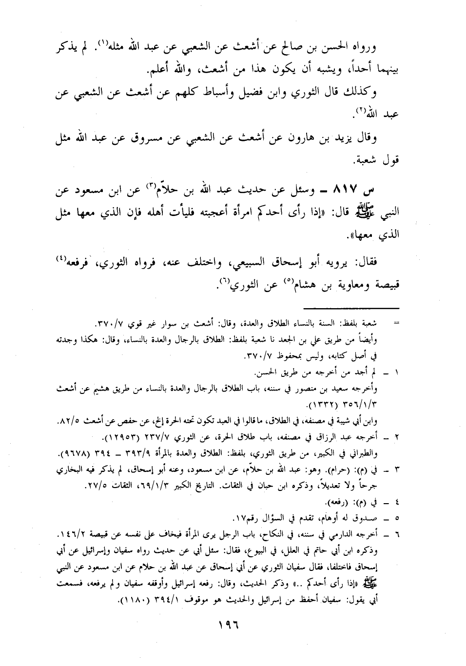 817- وَسُئِلَ عَنْ حَدِيثِ عَبْدِ اللَّهِ بْنِ حَلَّامٍ، عَنِ ابْنِ مَسْعُودٍ، عَنِ النَّبِيِّ صَلَّى اللَّهُ عَلَيْهِ وَسَلَّمَ، قَالَ: إِذَا رَأَى أَحَدُكُمُ امْرَأَةً أَعْجَبَتْهُ فَلْيَأْتِ أَهْلَهُ، فَإِنَّ الَّذِي مَعَهَا مِثْلَ الَّذِي مَعَهَا.