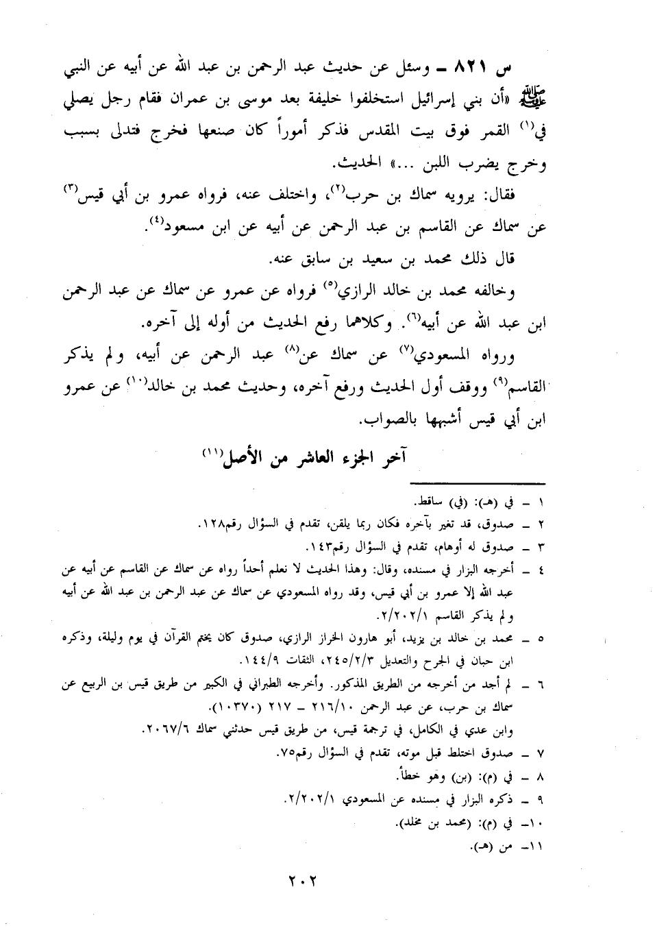 821- وَسُئِلَ عَنْ حَدِيثِ عَبْدِ الرَّحْمَنِ بْنِ عَبْدِ اللَّهِ، عَنْ أَبِيهِ، عَنِ النَّبِيِّ صَلَّى اللَّهُ عَلَيْهِ وَسَلَّمَ؛ أَنَّ بَنِي إِسْرَائِيلَ اسْتَخْلَفُوا خَلِيفَةً بَعْدَ مُوسَى بْنِ عِمْرَانَ، فَقَامَ رَجُلٌ يُصَلِّي فِي الْقَمَرِ فَوْقَ بَيْتِ الْمَقْدِسِ، فَذَكَرَ أُمُورًا كَانَ صَنَعَهَا فَخَرَجَ فَتَدَلَّى بِسَبَبٍ وَخَرَجَ يَضْرِبُ اللَّبَنَ، ... الْحَدِيثَ.