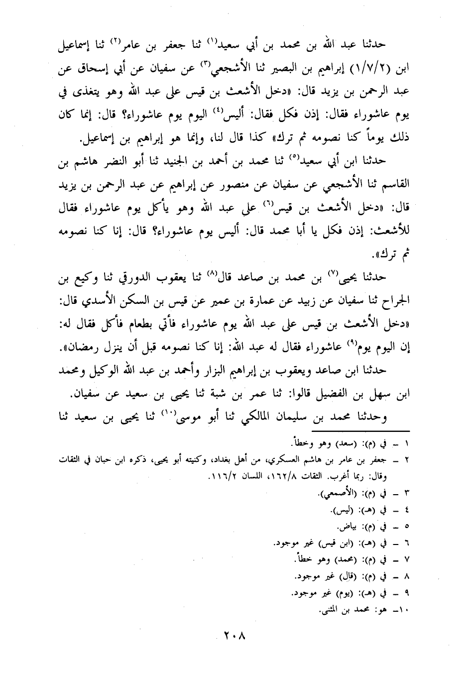 حَدَّثَنَا يحيى بن محمد بن صاعد، قال: حدثنا يعقوب الدورقي حدثنا وكيع بن الجراح حدثنا سُفْيَانُ، عَنْ زُبَيْدٍ عَنْ عُمَارَةَ بْنِ عُمَيْرٍ، عَنْ قَيْسِ بْنِ السَّكَنِ الْأَسَدِيِّ قَالَ دَخَلَ الْأَشْعَثُ بْنُ قَيْسٍ عَلَى عَبْدِ اللَّهِ يَوْمَ عَاشُورَاءَ فَأُتِيَ بِطَعَامٍ فَأَكَلَ فَقَالَ لَهُ إِنَّ الْيَوْمَ يَوْمُ عَاشُورَاءَ فَقَالَ لَهُ عَبْدُ اللَّهِ إِنَّا كُنَّا نَصُومُهُ قَبْلَ أَنْ يَنْزِلَ رَمَضَانُ