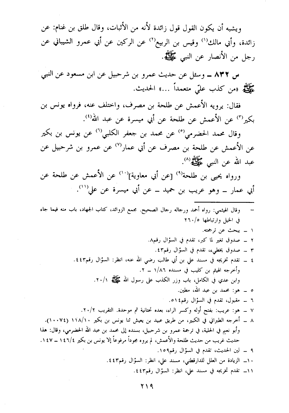 832- وسئل عن حديث عمرو بن شرحبيل، عَنِ ابْنِ مَسْعُودٍ، عَنِ النَّبِيِّ صَلَّى اللَّهُ عَلَيْهِ وَسَلَّمَ: مَنْ كَذَبَ عَلَيَّ مُتَعَمِّدًا، ... الْحَدِيثَ.
