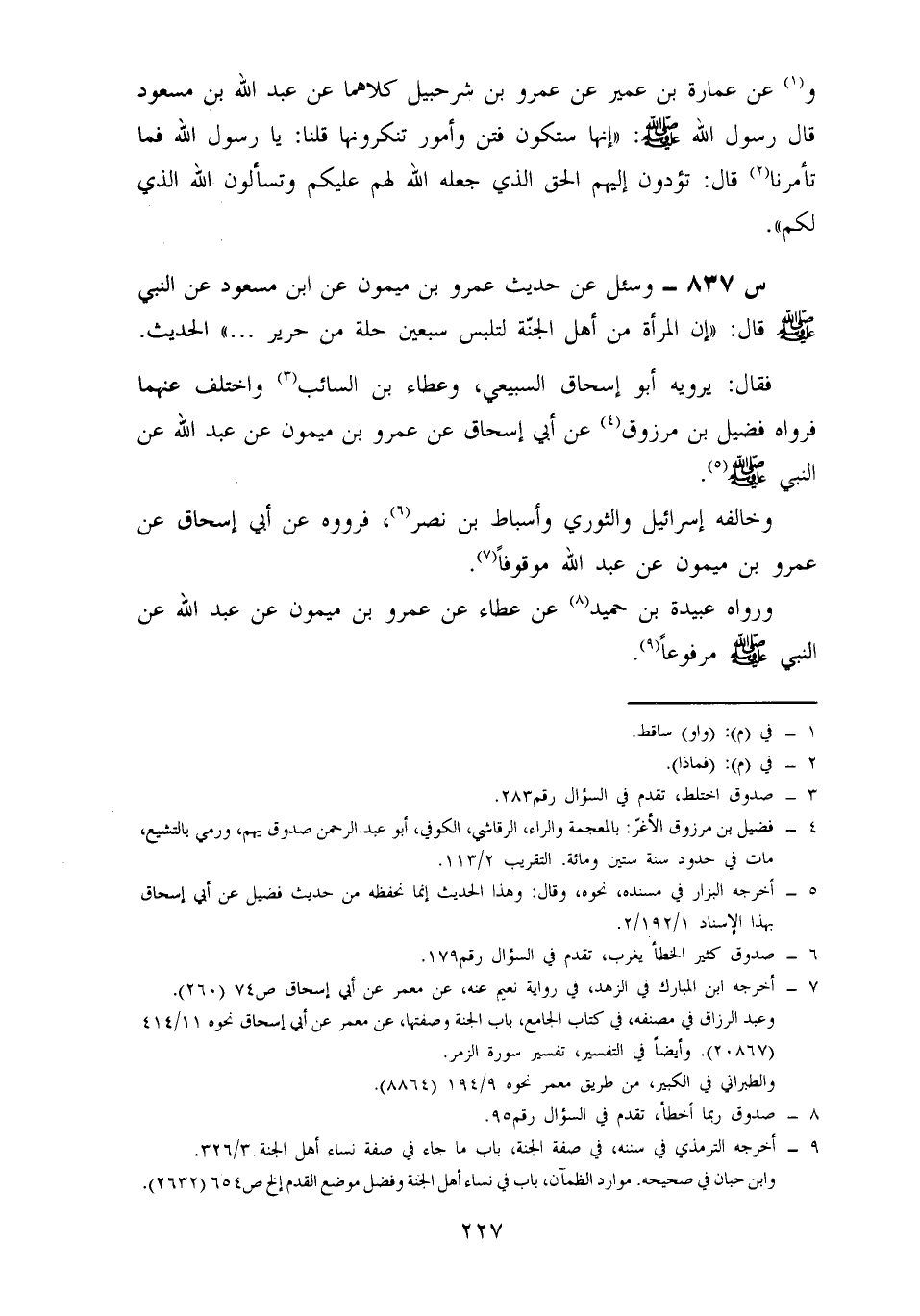 837- وَسُئِلَ عَنْ حَدِيثِ عَمْرِو بْنِ مَيْمُونٍ، عَنْ ابْنِ مَسْعُودٍ، عَنِ النَّبِيِّ صَلَّى اللَّهُ عَلَيْهِ وَسَلَّمَ، قَالَ: إِنَّ الْمَرْأَةَ مِنْ أَهْلِ الْجَنَّةِ لَتَلْبَسُ سَبْعِينَ حُلَّةً مِنْ حَرِيرٍ، ... الْحَدِيثَ.