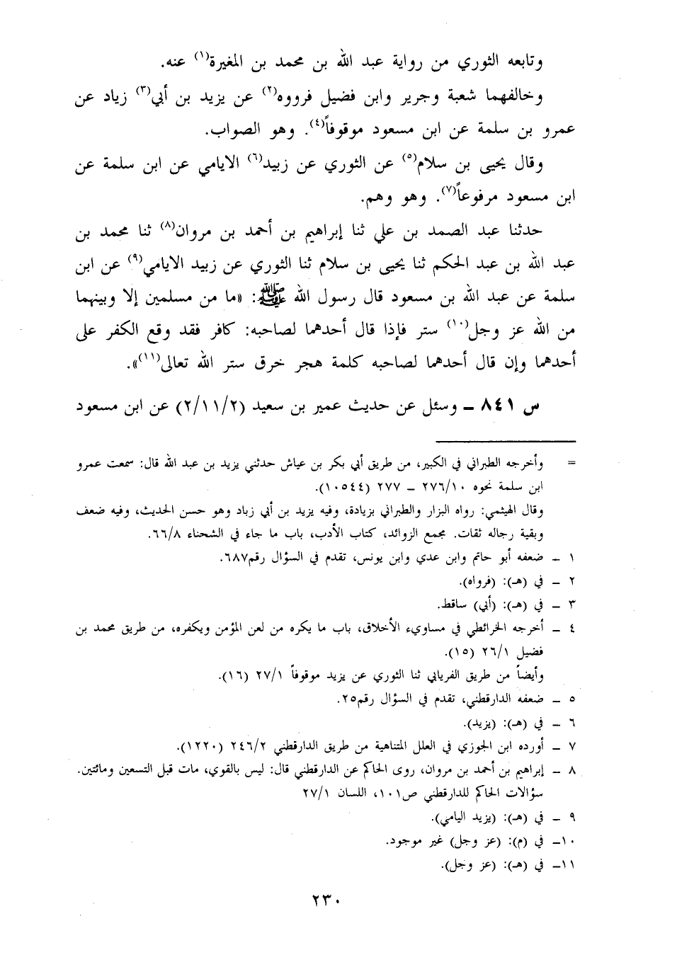 حدثنا عبد الصمد بن علي، حدثنا إبراهيم بن أحمد بن مروان، حدثنا مُحَمَّدُ بْنُ عَبْدِ اللَّهِ بْنِ عَبْدِ الْحَكَمِ، حدثنا يحيى بن سلام، حدثنا الثوري، عن زبيد الإيامي، عن ابن سلمة، عَنْ عَبْدِ اللَّهِ بْنِ مَسْعُودٍ، قَالَ رَسُولُ اللَّهِ صَلَّى اللَّهُ عَلَيْهِ وَسَلَّمَ: مَا مِنْ مُسْلِمَيْنِ إِلَّا وَبَيْنَهُمَا مِنَ اللَّهِ عَزَّ وَجَلَّ سِتْرٌ، فَإِذَا قَالَ أَحَدُهُمَا لِصَاحِبِهِ: كَافِرٌ فَقَدْ وَقَعَ الْكُفْرُ عَلَى أَحَدِهِمَا، وَإِنْ قَالَ أَحَدُهُمَا لصاحبه كلمة هجر خرق ستر الله تعالى.