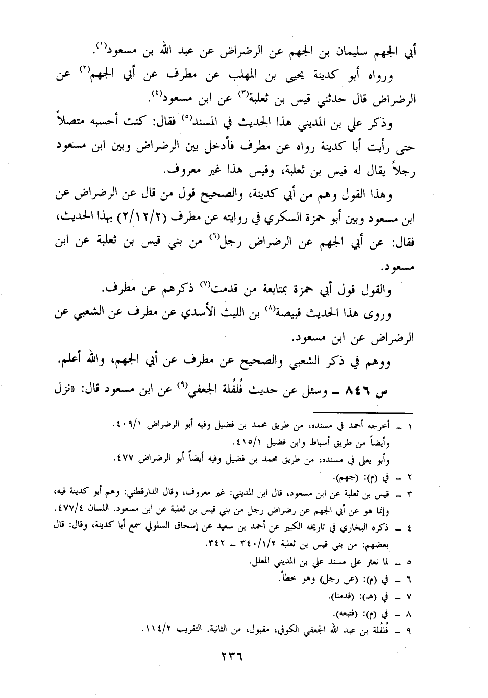 وَذَكَرَ عَلِيُّ بْنُ الْمَدِينِيِّ هَذَا الْحَدِيثَ فِي "الْمُسْنَدِ" فَقَالَ: كُنْتُ أَحْسِبُهُ مُتَّصِلًا، حَتَّى رَأَيْتُ أَبَا كُدَيْنَةَ رَوَاهُ عَنْ مُطَرِّفٍ، فَأَدْخَلَ بَيْنَ الرَّضْرَاضِ وَبَيْنَ ابْنِ مَسْعُودٍ رَجُلًا، يُقَالُ لَهُ: قَيْسُ بْنُ ثَعْلَبَةَ، وَقَيْسٌ هَذَا غَيْرُ مَعْرُوفٍ.