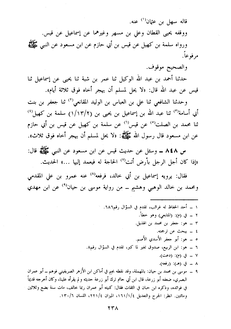 فَقَالَ: يَرْوِيهِ إِسْمَاعِيلُ بْنُ أَبِي خَالِدٍ، فَرَفَعَهُ عَنْهُ عَمْرُو بْنُ عَلِيٍّ الْمُقَدَّمِيُّ، وَمُحَمَّدُ بْنُ خَالِدٍ الْوَهْبِيُّ، وَهُشَيْمٌ مِنُ رِوَايَةِ مُوسَى بْنِ حَيَّانَ، عَنِ ابْنِ مَهْدِيٍّ عَنْهُ، وَغَيْرُهُ يَرْوِيهِ، عَنْ هُشَيْمٍ وَلَا يَرْفَعُهُ.