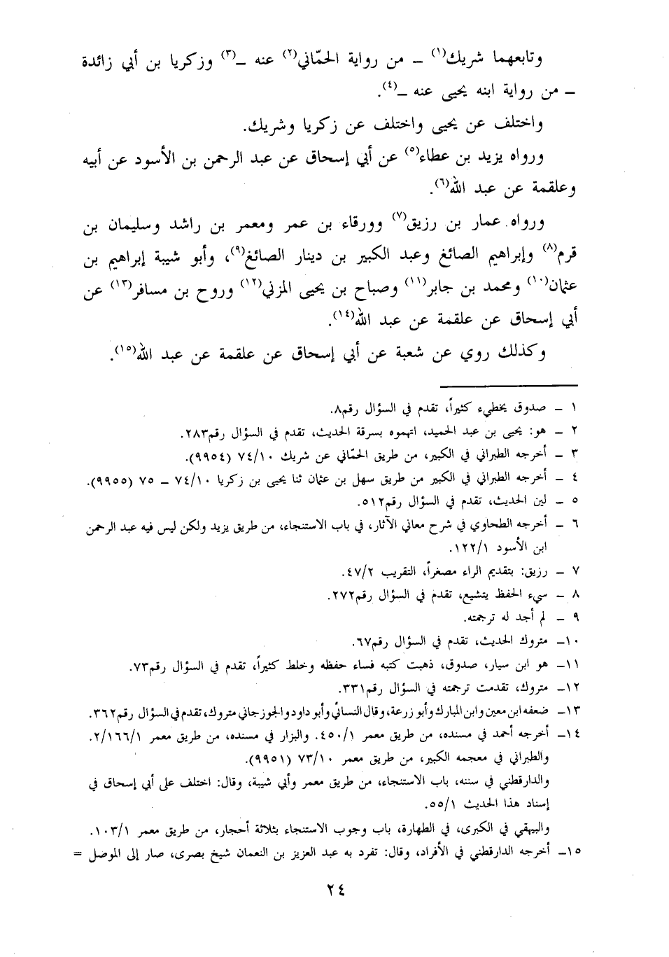 وَرَوَاهُ عَمَّارُ بْنُ رُزَيْقٍ، وَوَرْقَاءُ بْنُ عُمَرَ، وَمَعْمَرُ بْنُ رَاشِدٍ، وَسُلَيْمَانُ بْنُ قَرْمٍ، وَإِبْرَاهِيمُ الصَّائِغُ، وَعَبْدُ الكبير بن دينار الصائغ، وأبو شيبة إبراهيم بْنُ عُثْمَانَ، وَمُحَمَّدُ بْنُ جَابِرٍ، وَصَبَّاحُ بْنُ يَحْيَى الْمُزَنِيُّ، وَرَوْحُ بْنُ مُسَافِرٍ، عَنْ أَبِي إِسْحَاقَ، عَنْ عَلْقَمَةَ، عَنْ عَبْدِ اللَّهِ.