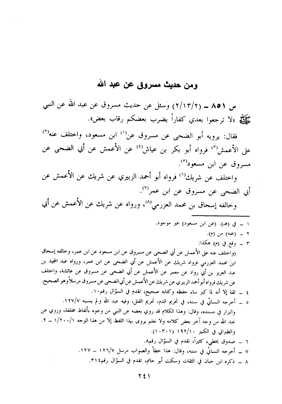 851- وَسُئِلَ عَنْ حَدِيثِ مَسْرُوقٍ، عَنْ عَبْدِ اللَّهِ، عَنِ النَّبِيِّ صَلَّى اللَّهُ عَلَيْهِ وَسَلَّمَ: لَا تَرْجِعُوا، بَعْدِي كُفَّارًا يَضْرِبُ بَعْضُكُمْ رِقَابَ بَعْضٍ.