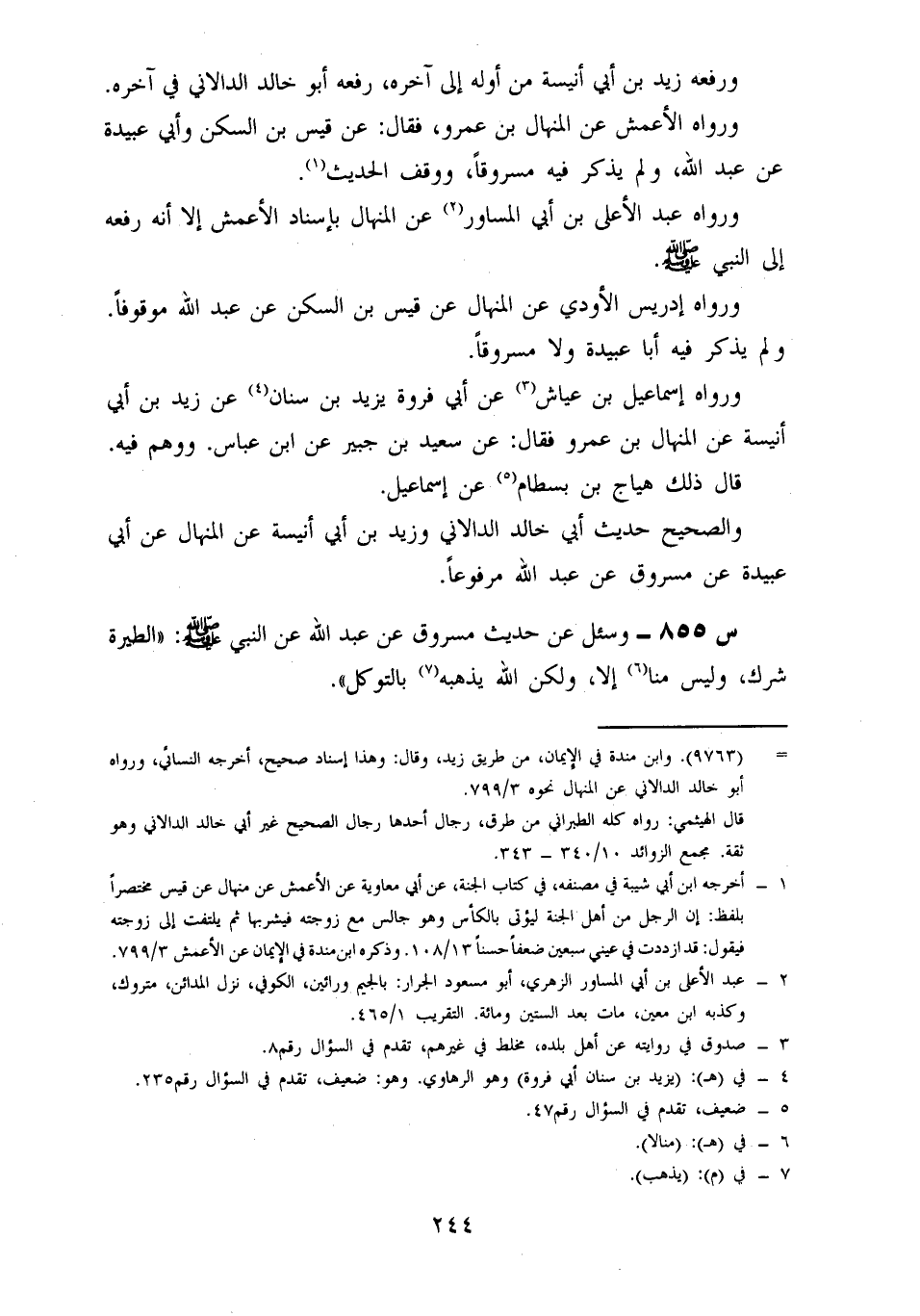 وَالصَّحِيحُ حَدِيثُ أَبِي خَالِدٍ الدَّالَانِيُّ، وَزَيْدُ بْنُ أَبِي أُنَيْسَةَ، عَنِ الْمِنْهَالِ، عَنْ أَبِي عُبَيْدَةَ، عَنْ مَسْرُوقٍ، عَنْ عَبْدِ اللَّهِ مَرْفُوعًا.