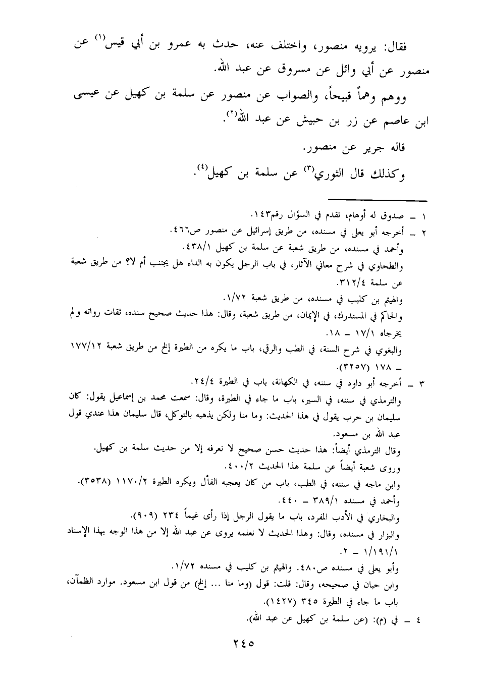 وَوَهِمَ وَهْمًا قَبِيحًا، وَالصَّوَابُ عَنْ مَنْصُورٍ، عَنْ سَلَمَةَ بْنِ كُهَيْلٍ، عَنْ عِيسَى بْنِ عَاصِمٍ، عَنْ زِرِّ بْنِ حُبَيْشٍ، عَنْ عَبْدِ اللَّهِ.