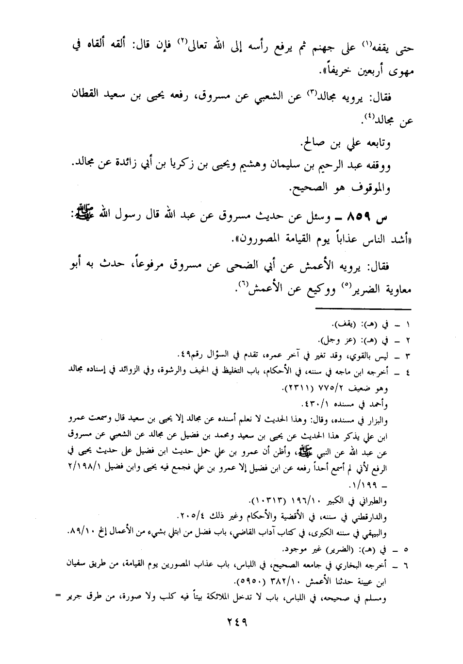 858- وَسُئِلَ عَنْ حَدِيثِ مَسْرُوقٍ، عَنْ عَبْدِ اللَّهِ، عَنِ النَّبِيِّ صَلَّى اللَّهُ عليه وسلم، قال: مَا مِنْ حَاكِمٍ يَحْكُمُ بَيْنَ النَّاسِ إِلَّا حُشِرَ يَوْمَ الْقِيَامَةِ، وَمَلَكٌ آخِذٌ بِقَفَاهُ حَتَّى يَقِفَهُ عَلَى جَهَنَّمَ، ثُمَّ يَرْفَعُ رَأْسَهُ إِلَى اللَّهِ تَعَالَى، فَإِنْ قَالَ: أَلْقِهِ أَلْقَاهُ فِي مَهْوًى أَرْبَعِينَ خَرِيفًا.