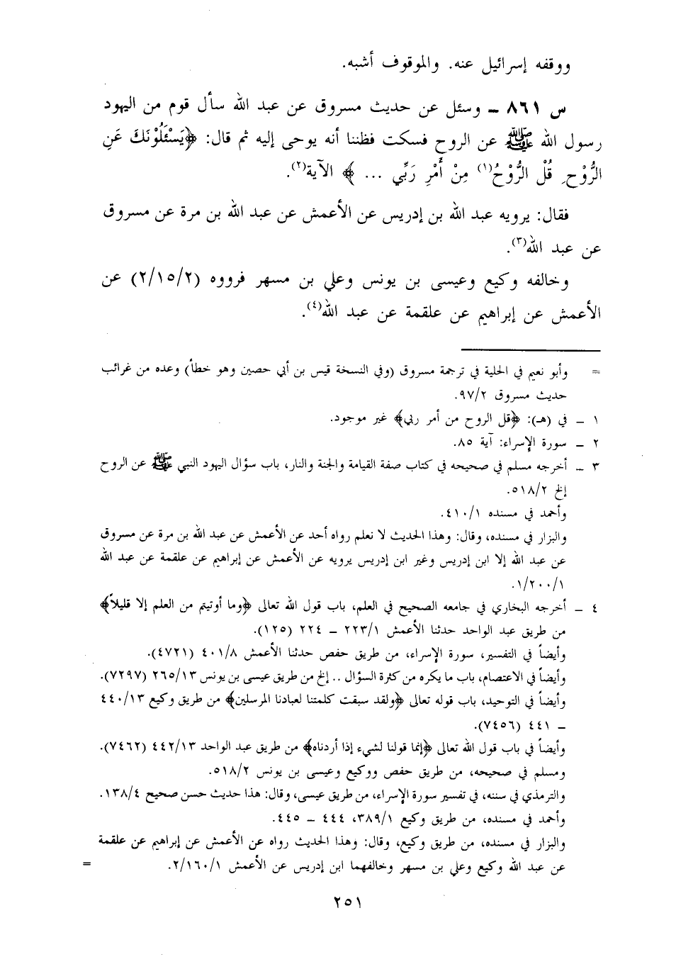 861- وَسُئِلَ عَنْ حَدِيثِ مَسْرُوقٍ، عَنْ عَبْدِ اللَّهِ سَأَلَ قَوْمٌ مِنَ الْيَهُودِ رَسُولَ اللَّهِ صَلَّى اللَّهُ عَلَيْهِ وَسَلَّمَ عَنِ الرُّوحِ فَسَكَتَ، فَظَنَنَّا أنه يوحى إليه، ثم قال: {يسألونك عَنِ الرُّوحِ قُلِ الرُّوحُ مِنْ أَمْرِ رَبِّي} ، الْآيَةَ.