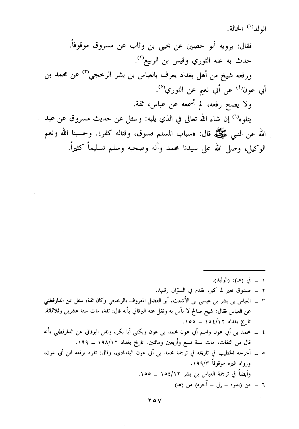 يَتْلُوهُ إِنْ شَاءَ اللَّهُ تَعَالَى فِي الَّذِي يَلِيهِ وَسُئِلَ عَنْ حَدِيثِ مَسْرُوقٍ عَنْ عَبْدِ اللَّهِ عَنِ النَّبِيِّ صَلَّى اللَّهُ عليه وسلم قال سِبَابُ الْمُسْلِمِ فُسُوقٌ وَقِتَالُهُ كُفْرٌ.
