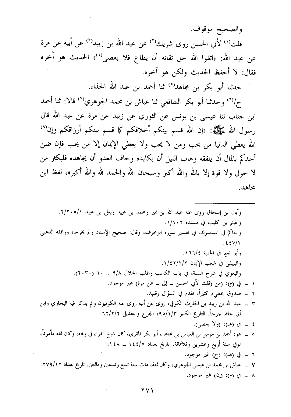 حدثنا أبو بكر بن مجاهد، حدثنا أَحْمَدُ بْنُ عَبْدِ اللَّهِ الْحَذَّاءُ (ح) وَحَدَّثَنَا أبو بكر الشافعي، حدثنا عياش بن محمد الجوهري، قالا: حدثنا أحمد بن جناب، حدثنا عيسى بن يونس، عن الثوري، عن زبيد، عَنْ مُرَّةَ، عَنْ عَبْدِ اللَّهِ، قَالَ رَسُولُ اللَّهِ صَلَّى اللَّهُ عَلَيْهِ وَسَلَّمَ: إِنَّ اللَّهَ قَسَمَ بَيْنَكُمْ أَخْلَاقَكُمْ كَمَا قَسَمَ بَيْنَكُمْ أَرْزَاقَكُمْ، وَإِنَّ اللَّهَ يُعْطِي الدُّنْيَا مَنْ يُحِبُّ وَمَنْ لَا يُحِبُّ، وَلَا يُعْطِي الْإِيمَانَ إِلَّا مَنْ يُحِبُّ، فَإِنْ ضَنَّ أَحَدُكُمْ بِالْمَالِ أَنْ يُنْفِقَهُ وَهَابَ اللَّيْلَ أَنْ يُكَابِدَهُ وَخَافَ الْعَدُوَّ أَنْ يُجَاهِدَهُ، فَلْيُكْثِرْ مِنْ: لَا حَوْلَ وَلَا قُوَّةَ إِلَّا بِاللَّهِ، وَاللَّهُ أَكْبَرُ، وَسُبْحَانَ اللَّهِ، وَالْحَمْدُ لله، والله أكبر، لفظ ابن مجاهد.