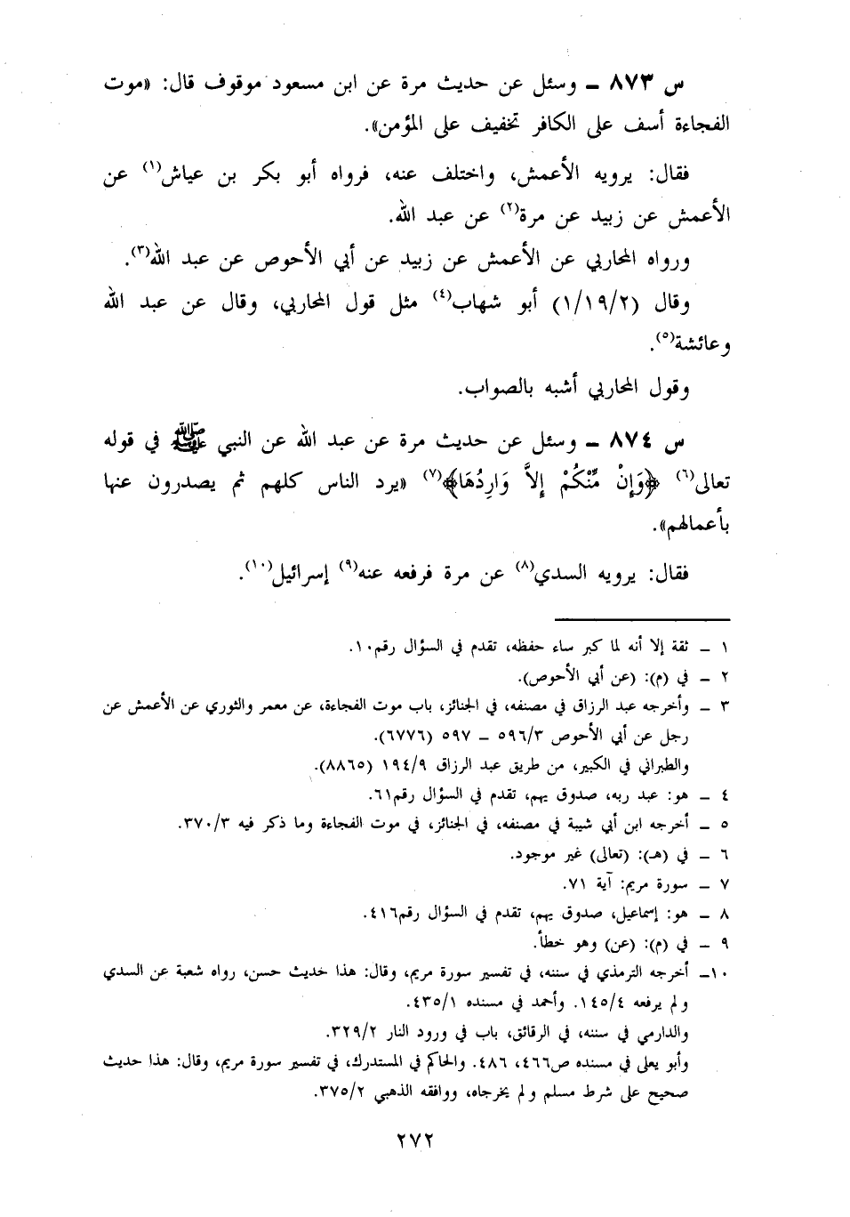 874- وَسُئِلَ عَنْ حَدِيثِ مُرَّةَ، عَنْ عَبْدِ اللَّهِ، عَنِ النَّبِيِّ صَلَّى اللَّهُ عليه وسلم في قوله تعالى: {وإن منكم إلا واردها} ، يَرِدُ النَّاسُ كُلُّهُمْ ثُمَّ يَصْدُرُونَ عَنْهَا بِأَعْمَالِهِمْ.