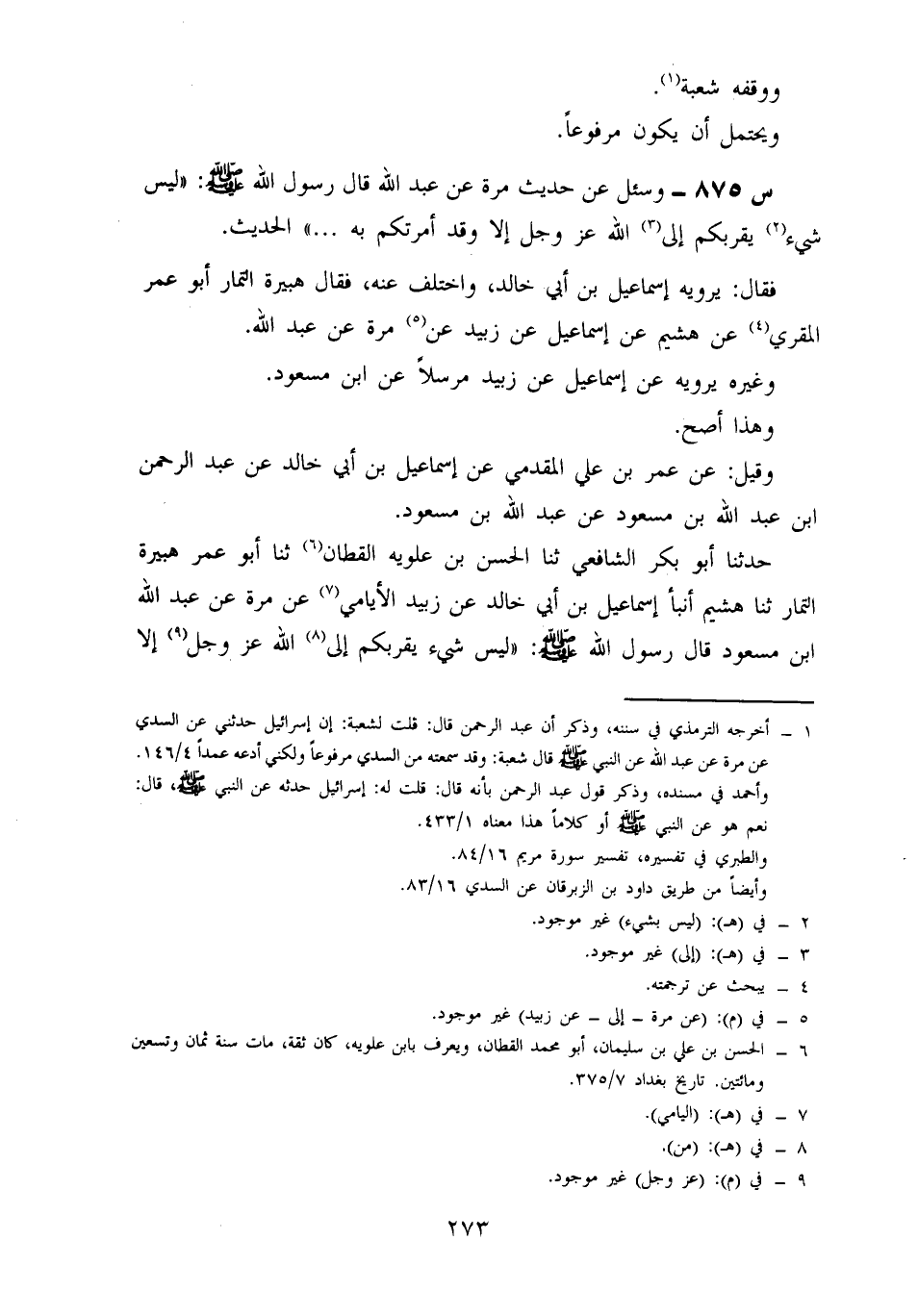 875- وَسُئِلَ عَنْ حَدِيثِ مُرَّةَ، عَنْ عَبْدِ اللَّهِ، قال رسول الله صلى الله عليه وسلم: لَيْسَ شَيْءٌ يُقَرِّبُكُمْ إِلَى اللَّهِ عَزَّ وَجَلَّ إِلَّا وَقَدْ أَمَرْتُكُمْ بِهِ، ... الْحَدِيثَ.