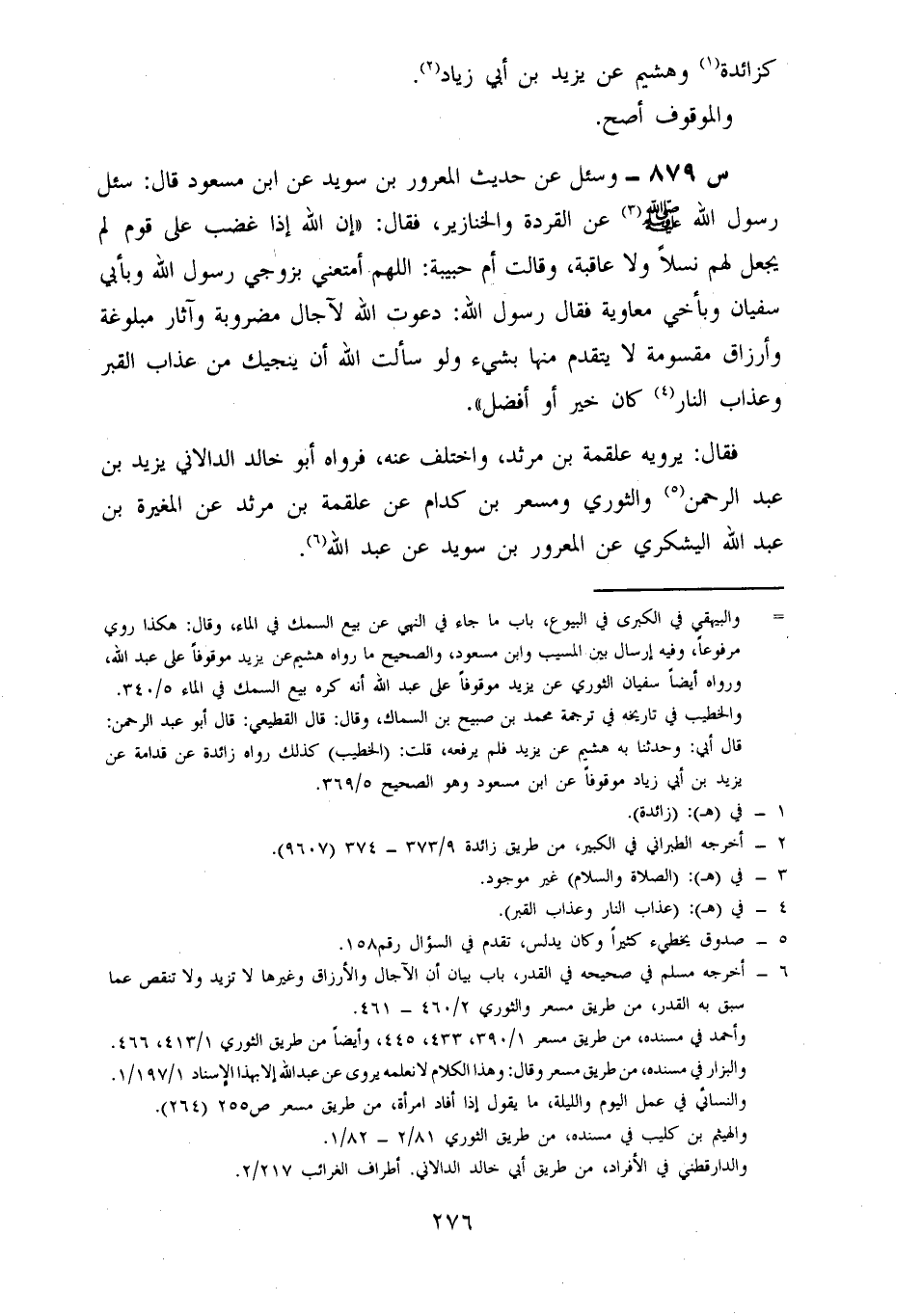 879- وسئل عن حديث المعرور بن سويد، عن ابْنِ مَسْعُودٍ، قَالَ: سُئِلَ رَسُولُ اللَّهِ صَلَّى اللَّهُ عَلَيْهِ وَسَلَّمَ عَنِ الْقِرَدَةِ، وَالْخَنَازِيرِ، فَقَالَ: إِنَّ اللَّهَ إِذَا غَضِبَ عَلَى قَوْمٍ لَمْ يَجْعَلْ لَهُمْ نَسْلًا وَلَا عَاقِبَةً، وَقَالَتْ أُمُّ حَبِيبَةَ: اللَّهُمَّ أَمْتِعْنِي بِزَوْجِي رَسُولِ اللَّهِ، وَبِأَبِي سُفْيَانَ، وَبِأَخِي مُعَاوِيَةَ، فَقَالَ رَسُولُ اللَّهِ صَلَّى اللَّهُ عَلَيْهِ وَسَلَّمَ: دَعَوْتِ اللَّهَ لِآجَالٍ مَضْرُوبَةٍ، وَآثَارٍ مَبْلُوغَةٍ، وَأَرْزَاقٍ مَقْسُومَةٍ، لَا يَتَقَدَّمُ مِنْهَا بِشَيْءٍ وَلَوْ سَأَلْتِ اللَّهَ أَنْ يُنْجِيَكِ مِنْ عَذَابِ الْقَبْرِ وَعَذَابِ النَّارِ كَانَ خَيْرًا أَوْ أَفْضَلَ.
