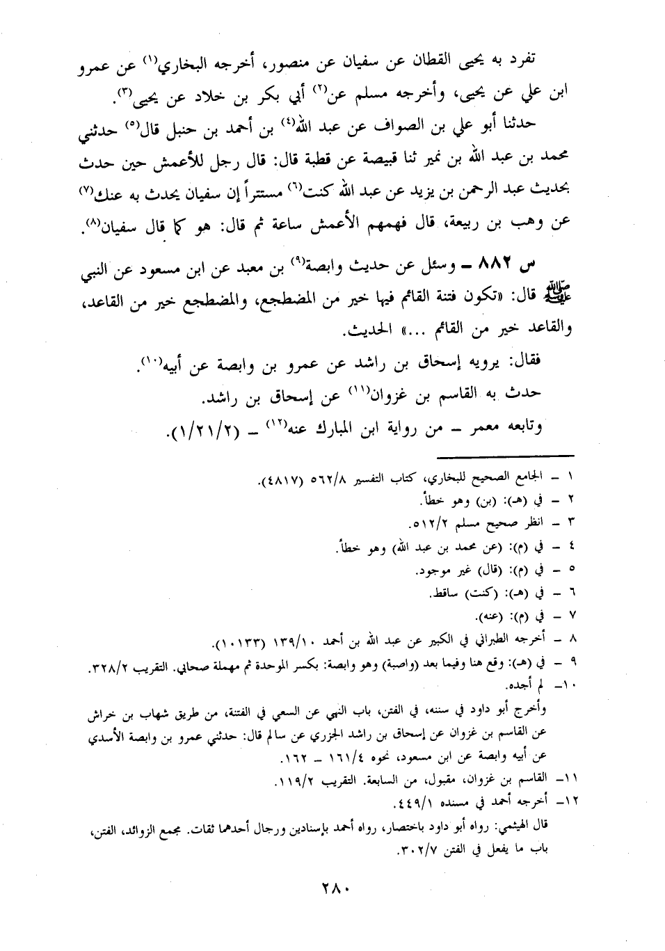 882- وَسُئِلَ عَنْ حَدِيثِ وَابِصَةَ بْنِ مَعْبَدٍ، عَنِ ابْنِ مَسْعُودٍ، عَنِ النَّبِيِّ صَلَّى اللَّهُ عَلَيْهِ وَسَلَّمَ، قَالَ: تَكُونُ فِتْنَةٌ الْقَائِمُ فِيهَا خَيْرٌ مِنَ الْمُضْطَجِعِ، وَالْمُضْطَجِعُ خَيْرٌ مِنَ الْقَاعِدِ، وَالْقَاعِدُ خَيْرٌ مِنَ الْقَائِمِ، ... الْحَدِيثَ.