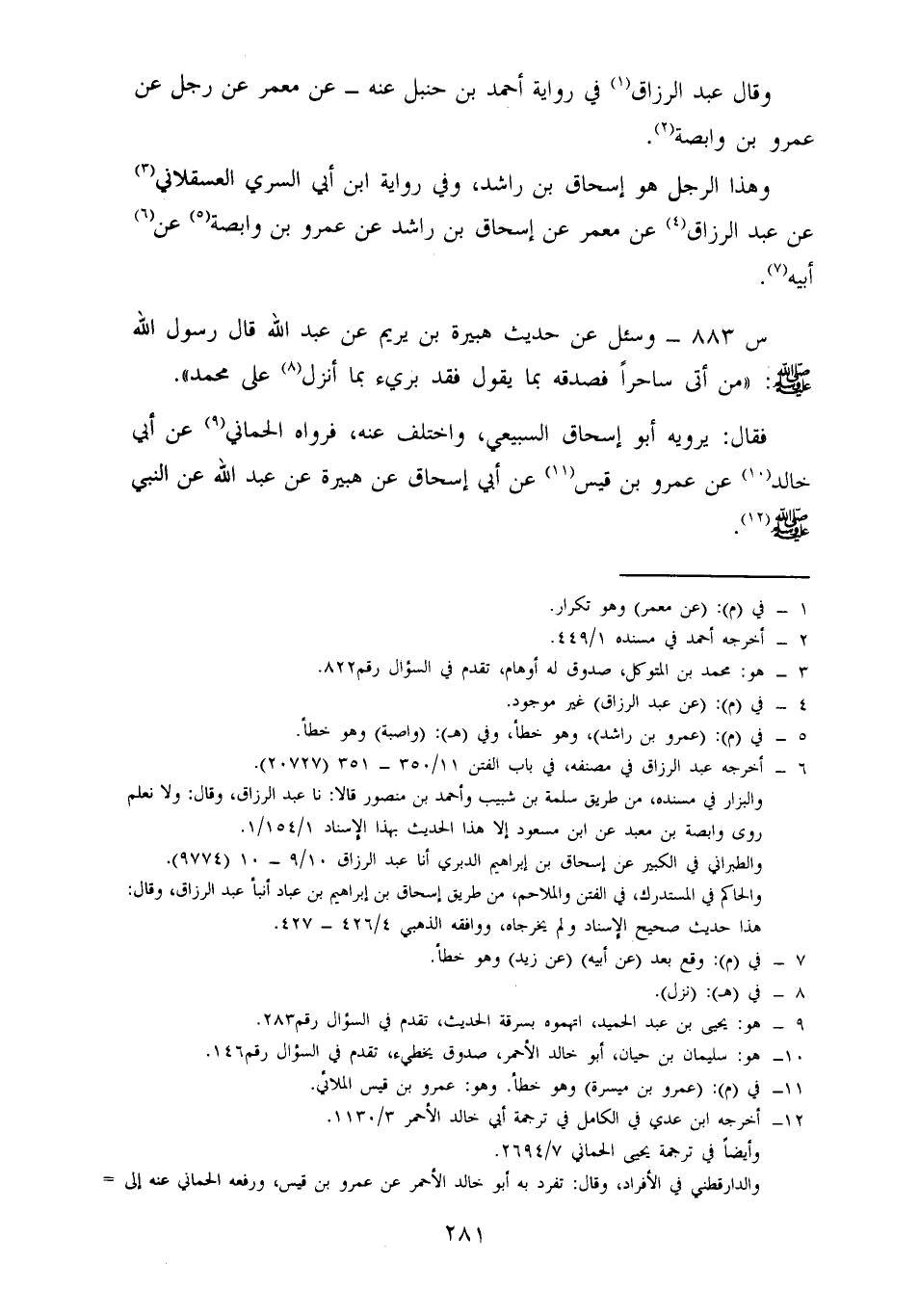 883- وَسُئِلَ عَنْ حَدِيثِ هُبَيْرَةَ بْنِ يَرِيمَ، عَنْ عَبْدِ اللَّهِ، قَالَ رَسُولُ اللَّهِ صَلَّى اللَّهُ عَلَيْهِ وَسَلَّمَ: مَنْ أَتَى سَاحِرًا فَصَدَّقَهُ بِمَا يَقُولُ فَقَدْ بَرِيءَ بِمَا أُنْزِلَ عَلَى مُحَمَّدٍ.