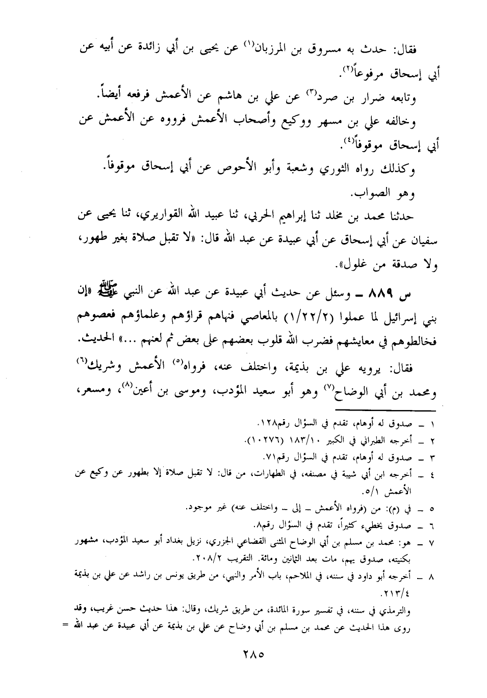 888- وَسُئِلَ عَنْ حَدِيثِ أَبِي عُبَيْدَةَ، عَنْ عَبْدِ اللَّهِ، عَنِ النَّبِيِّ صَلَّى اللَّهُ عَلَيْهِ وَسَلَّمَ: لَا تُقْبَلُ صَلَاةٌ بِغَيْرِ طُهُورٍ.