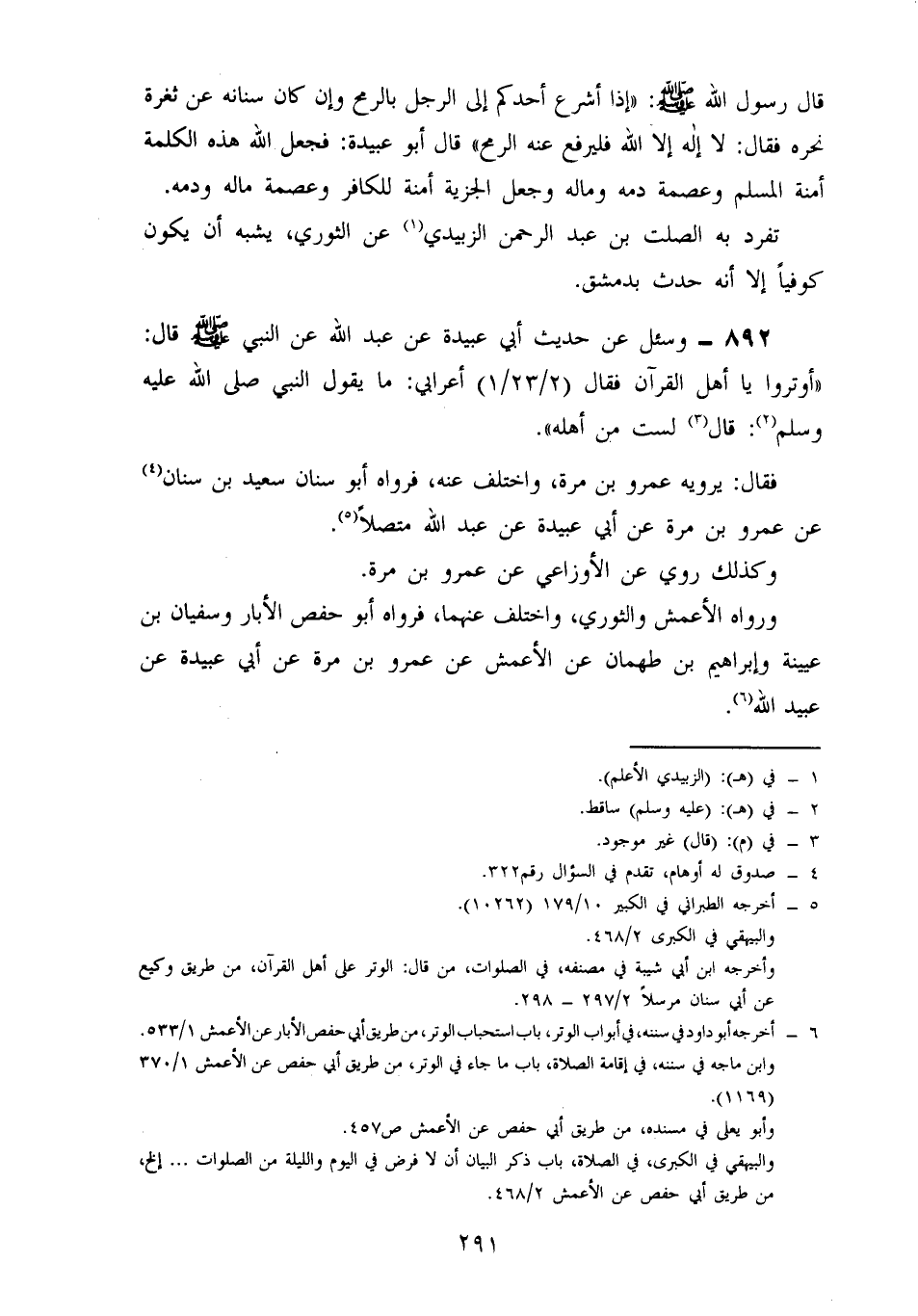 892- وَسُئِلَ عَنْ حَدِيثِ أَبِي عُبَيْدَةَ، عَنْ عَبْدِ اللَّهِ، عَنِ النَّبِيِّ صَلَّى اللَّهُ عَلَيْهِ وَسَلَّمَ، قَالَ: أَوَتَرَوْا يَا أَهْلَ الْقُرْآنِ، فَقَالَ أَعْرَابِيٌّ: مَا يَقُولُ النَّبِيُّ صَلَّى اللَّهُ عَلَيْهِ وَسَلَّمَ؟ قَالَ: لَسْتَ مِنْ أَهْلِهِ.