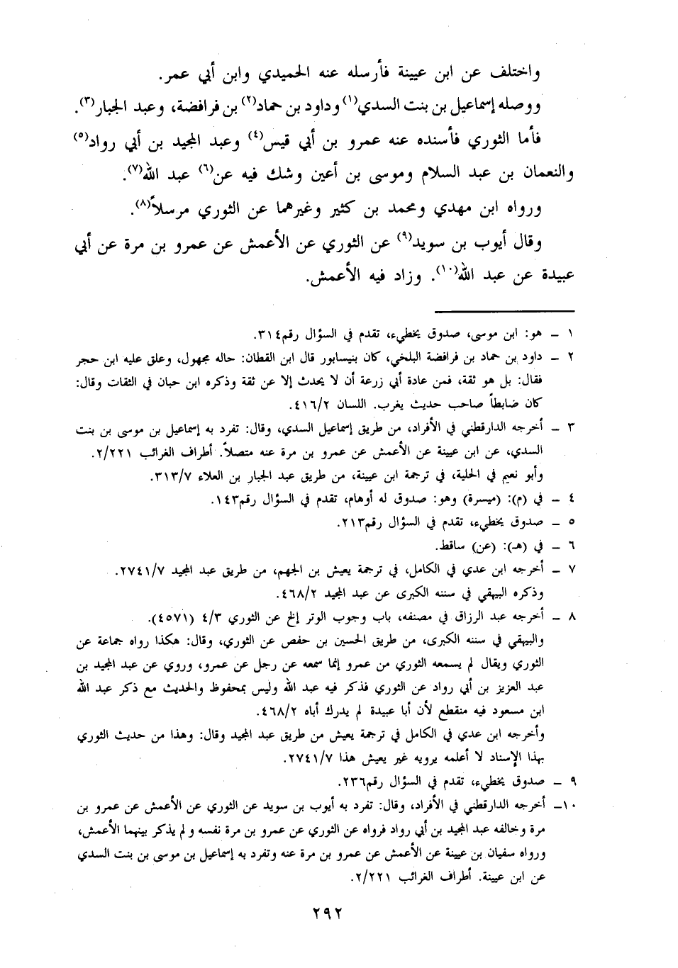 وَاخْتُلِفَ عَنِ ابْنِ عُيَيْنَةَ، فَأَرْسَلَهُ عَنْهُ الْحُمَيْدِيُّ، وَابْنُ أَبِي عُمَرَ.